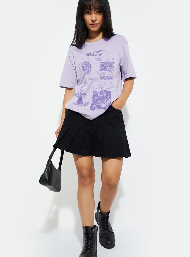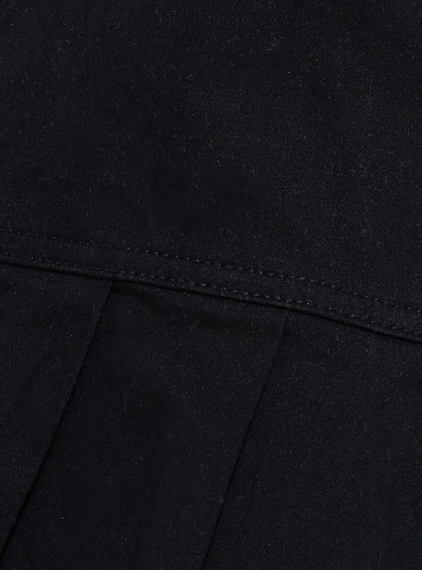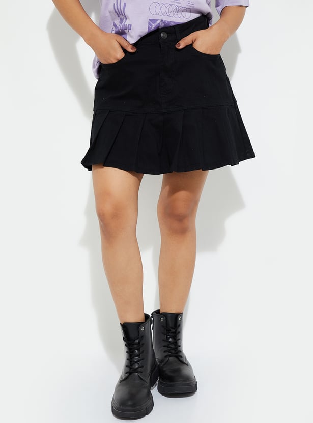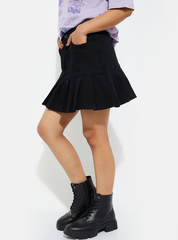 This pleated mini skirt combines playful style with practical details. It features a button closure for a secure fit and handy pockets for added convenience.