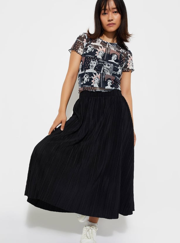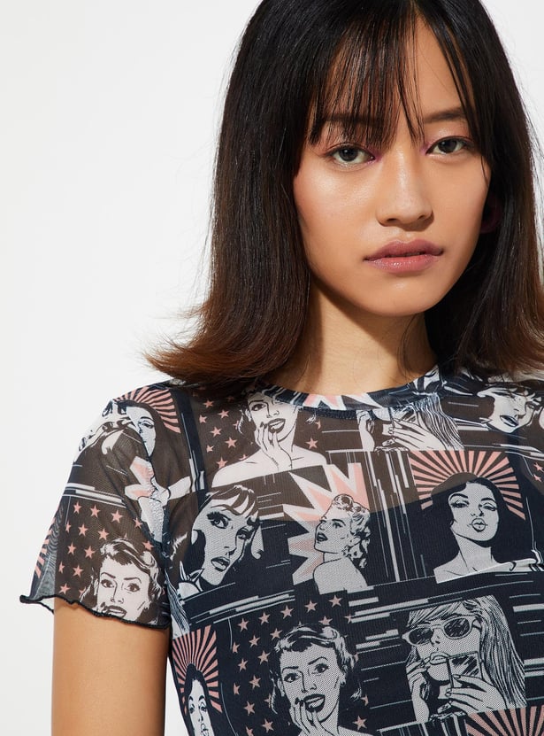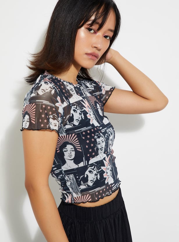 Switch up your style with this printed mesh top, perfect for your casual collection. Featuring a round neck, half sleeves, and a lettuce hem, it comes with a solid camisole for added versatility.