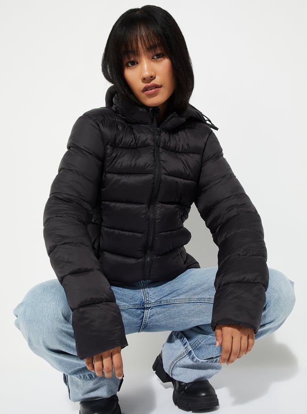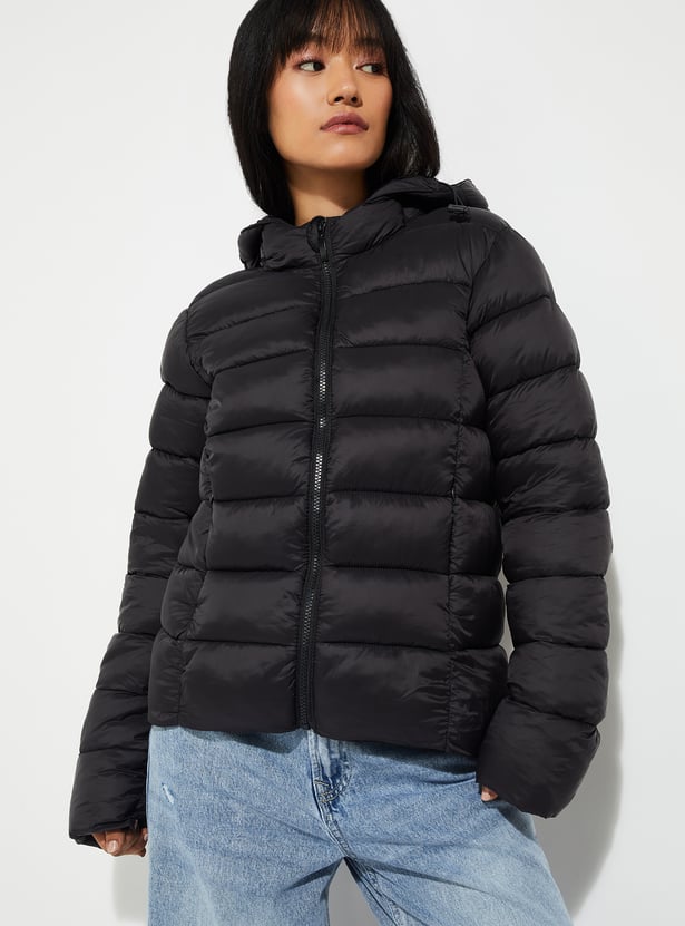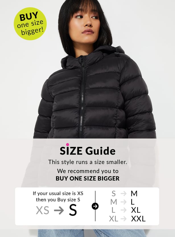 Stay warm and stylish with this quilted hooded jacket, featuring full sleeves, a zip closure, and side pockets for added convenience. Its quilted design offers both comfort and a trendy, casual look.