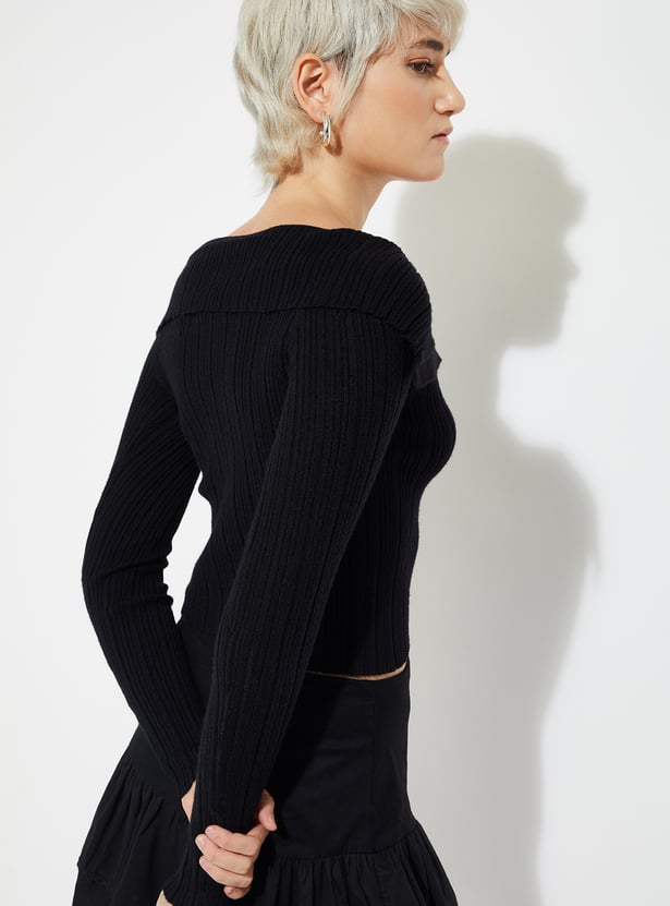 Step up your style game with this ribbed top, featuring full sleeves, off shoulder, and a chic button closure for a modern, trendy look.