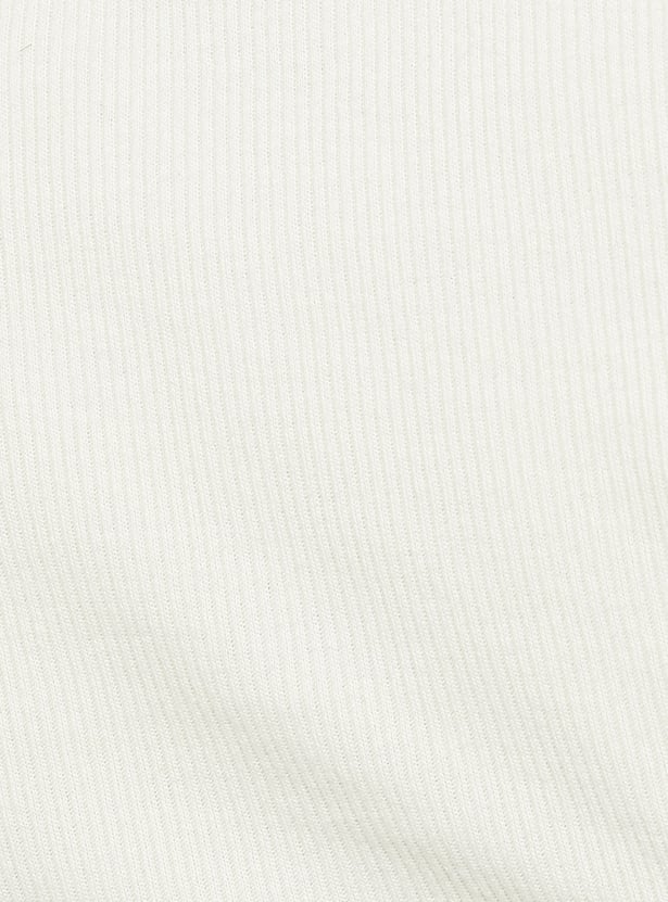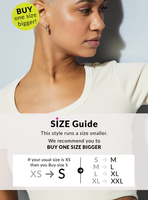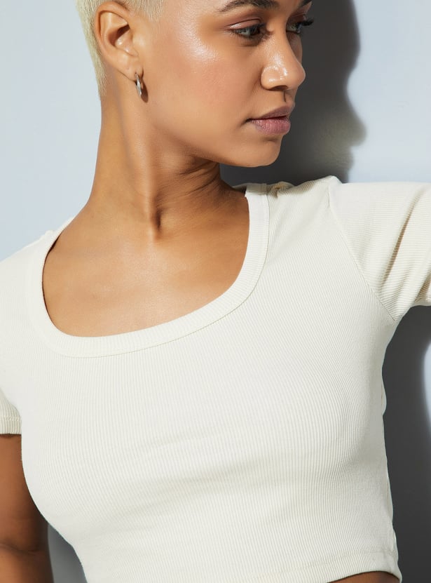Give your wardrobe a makeover with this trendy and stylish crop top. Featuring a ribbed surface, round neckline, and half sleeves, it effortlessly combines comfort and fashion.