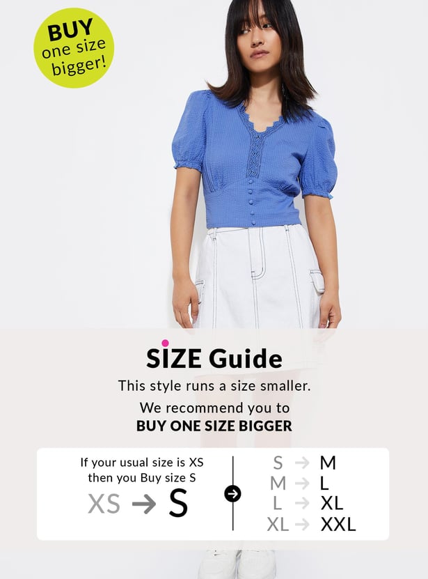 Unleash your urban edge with the seersucker detailed crop top. It is designed with a V-neck, puff sleeves and lace detail. Crafted for a relaxed look, this stylish piece adds a touch of flair to any outfit.