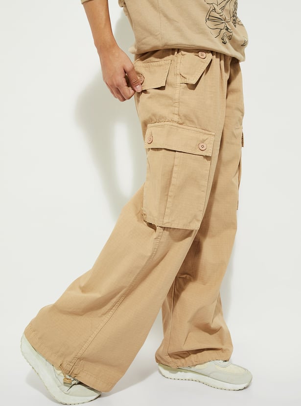 Step up your street style with this pair of relaxed-fit parachute pants. The cargo pockets add functional value, while the drawcords at the hem lend a trendy, edgy look. This pair has a drawstring waist and 4 flap pockets with button closure for a utility-inspired look.