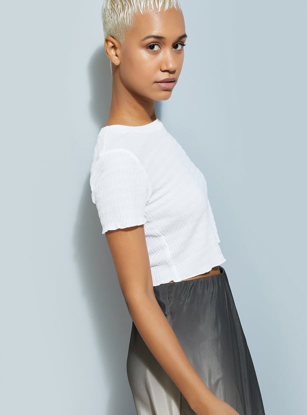 Give your wardrobe a makeover with this trendy and stylish crop top. Featuring a textured surface, round neckline, and half sleeves, it effortlessly combines comfort and fashion.