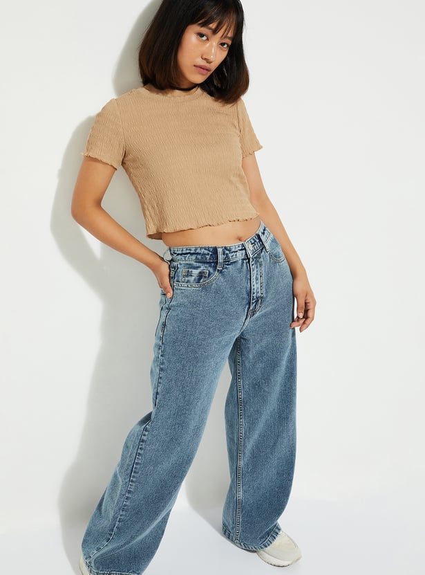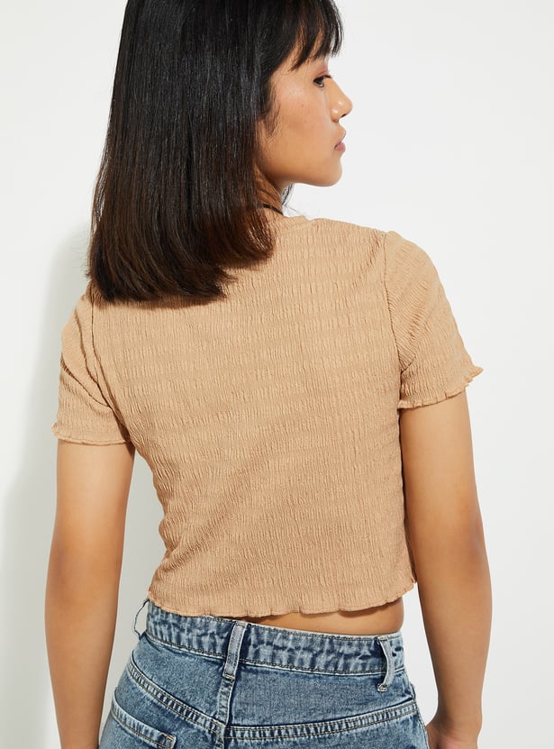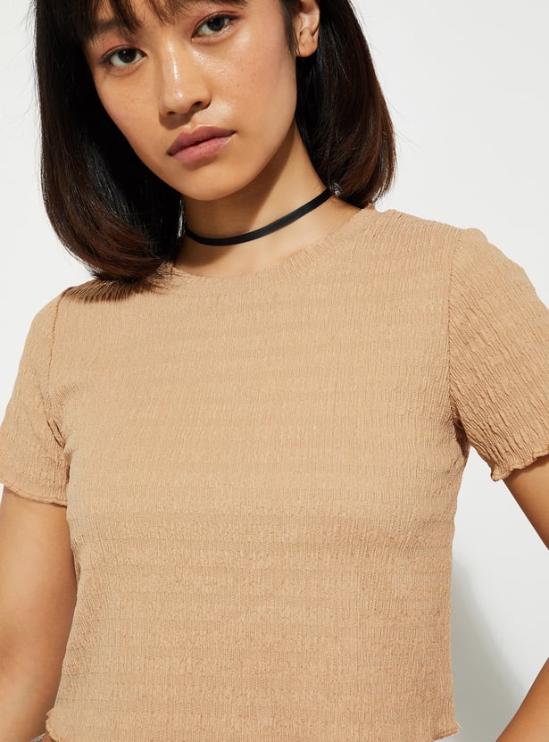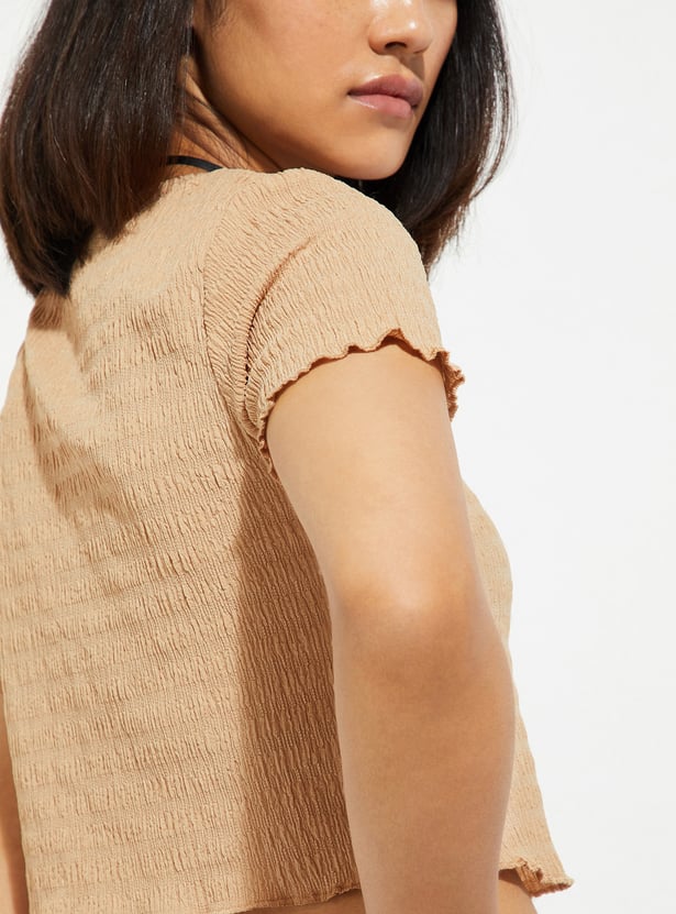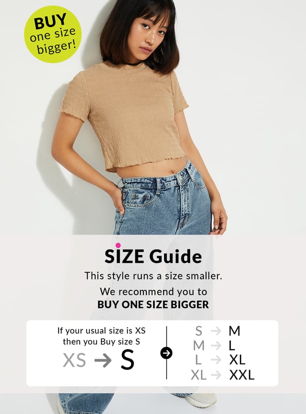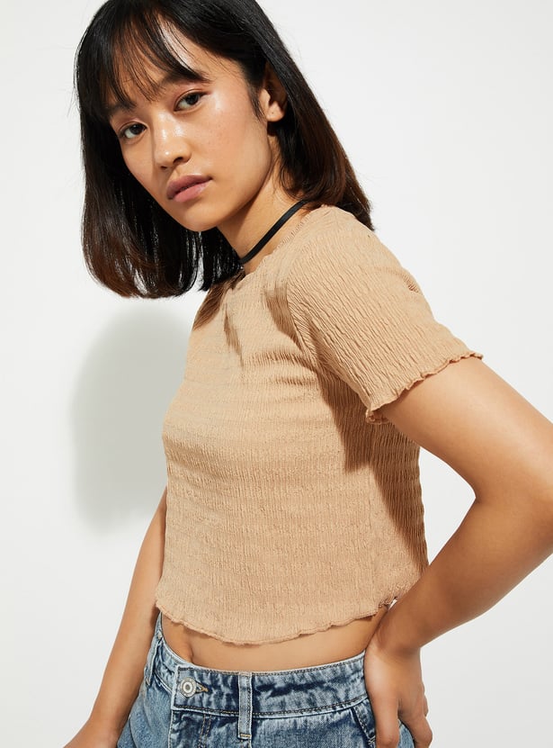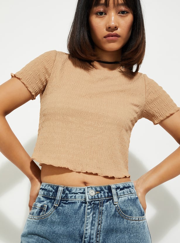 Give your wardrobe a makeover with this trendy and stylish crop top. Featuring a textured surface, round neckline, and half sleeves, it effortlessly combines comfort and fashion.
