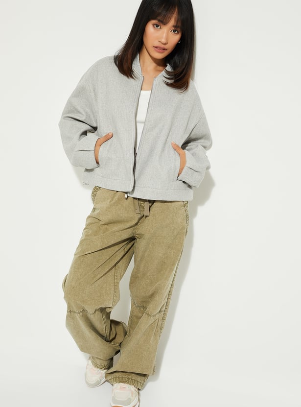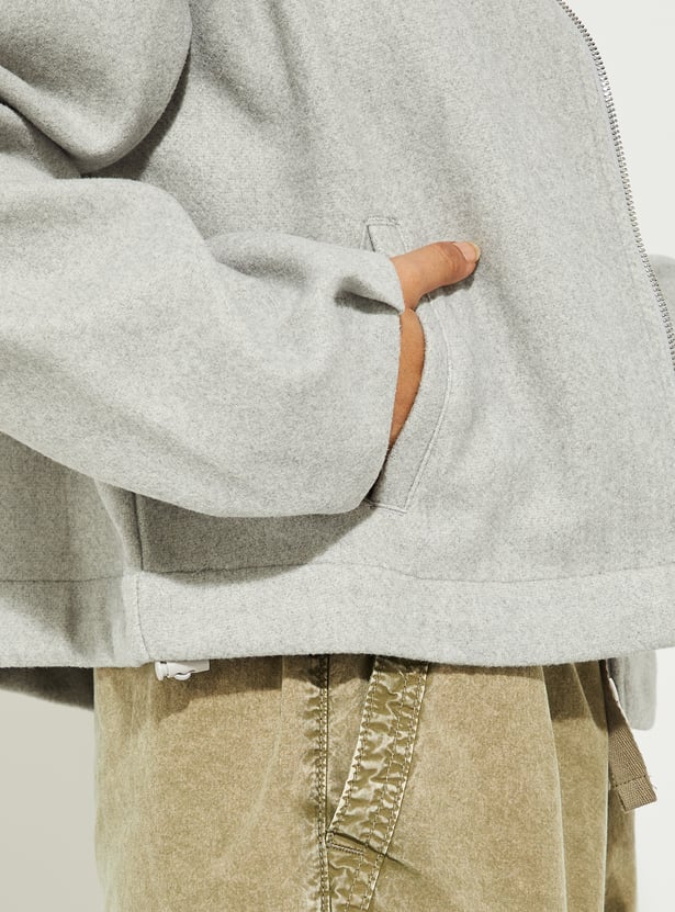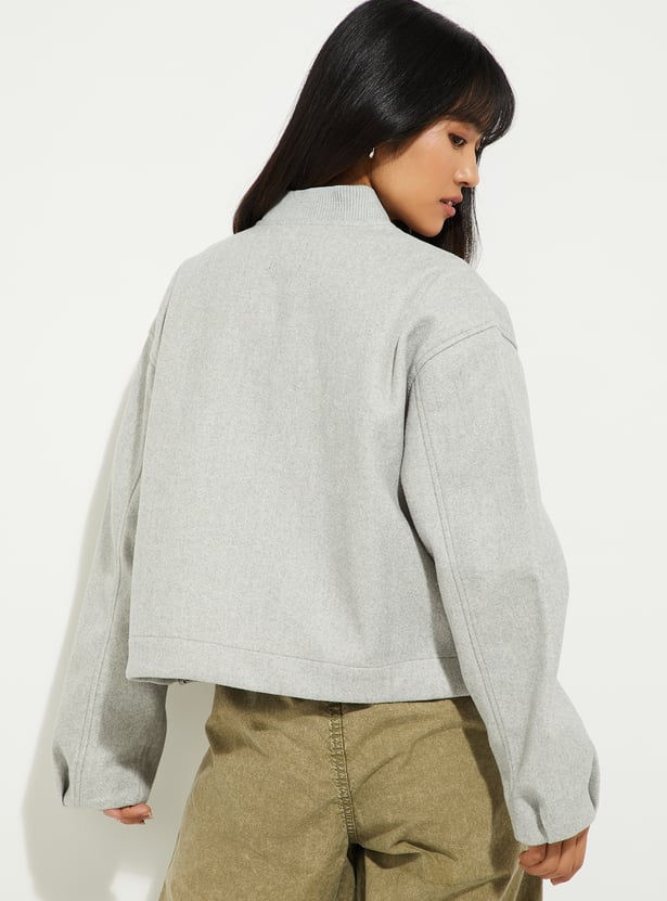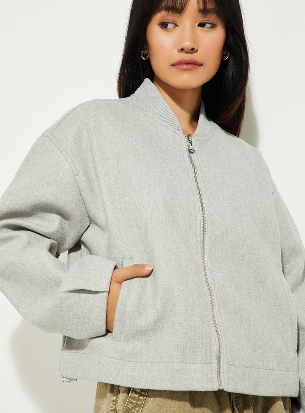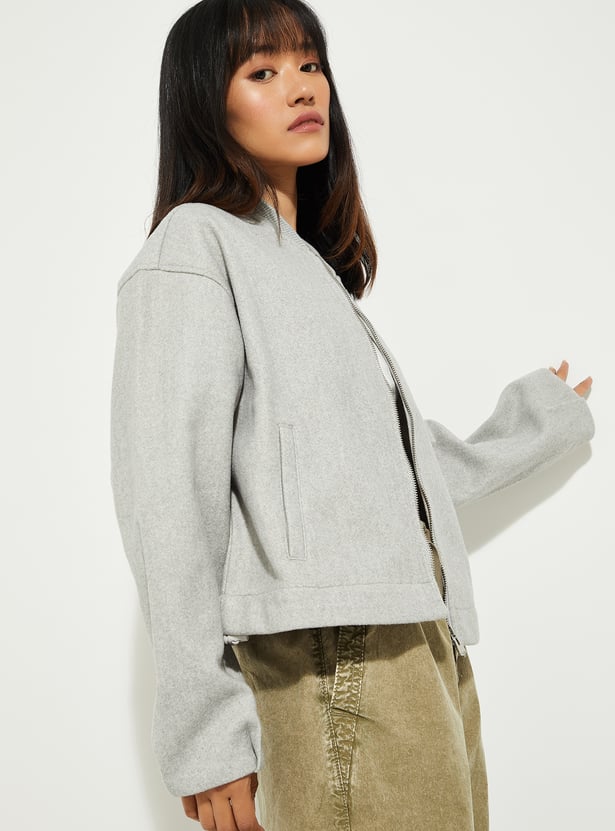 Hit it out of the park with this jacket. Featuring a classic baseball collar and soft felt fabric, this jacket brings a sporty twist to your wardrobe. It has full sleeves, waist pockets, and a zip front.