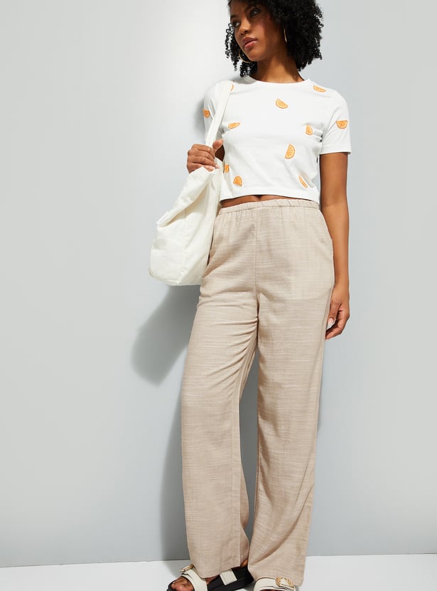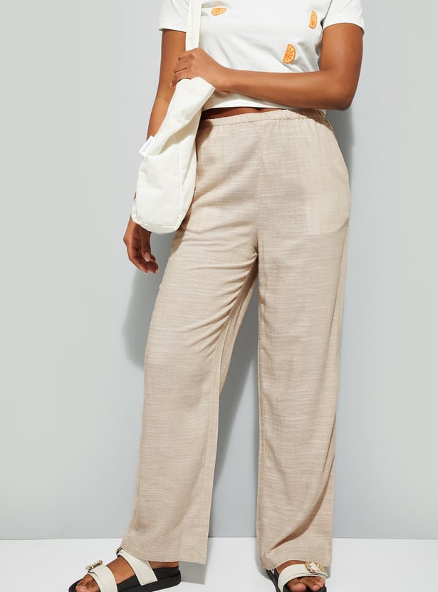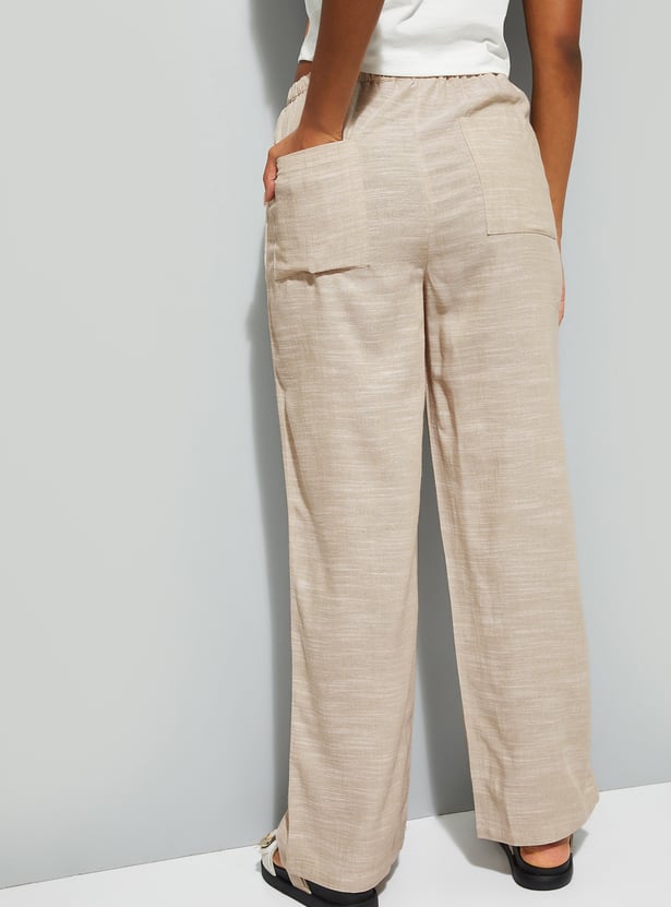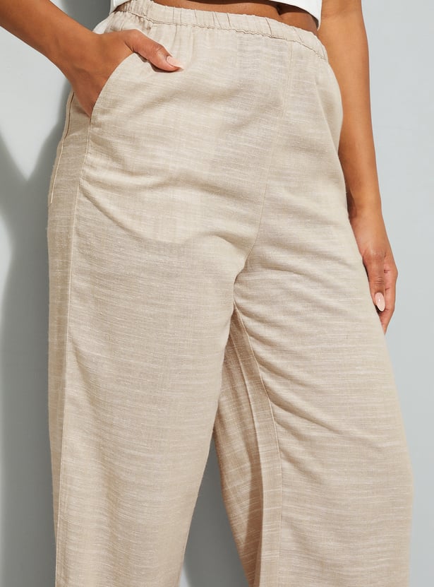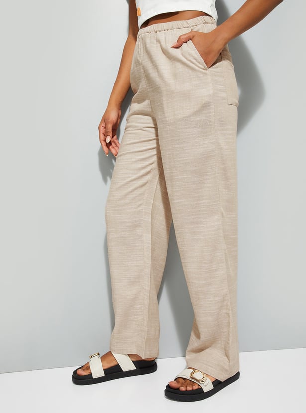 These wide-leg woven pants feature a flat front design with insert pockets and an elasticated waistband with belt loops.