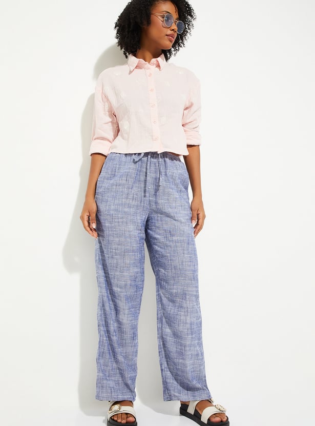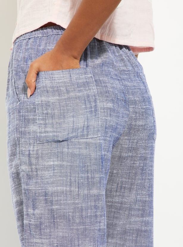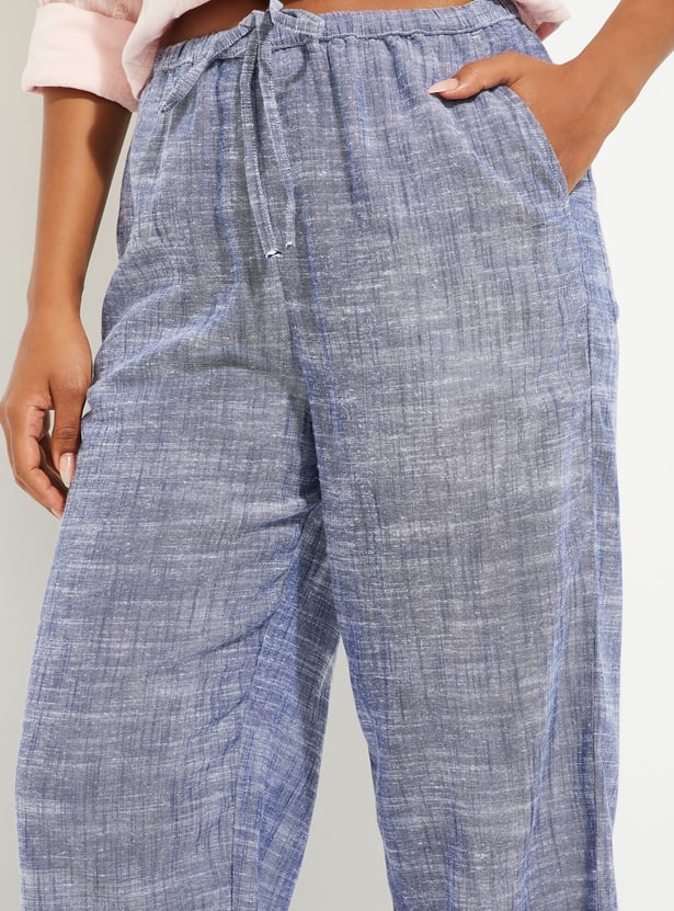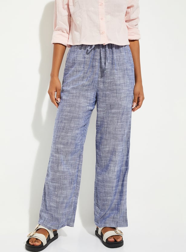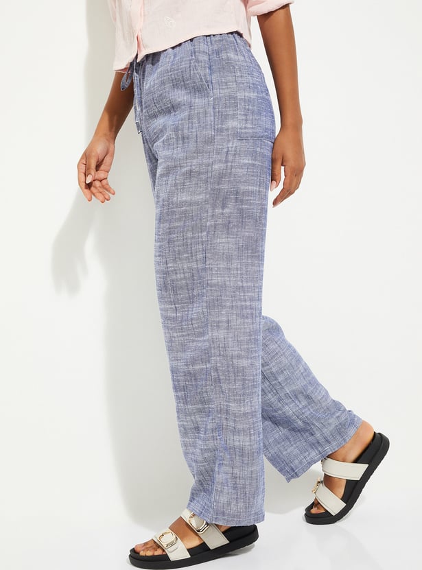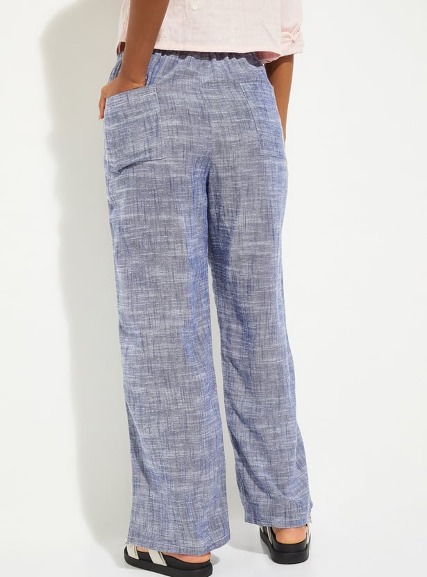 These wide-leg woven pants feature a flat front design with insert pockets and an elasticated waistband with belt loops.