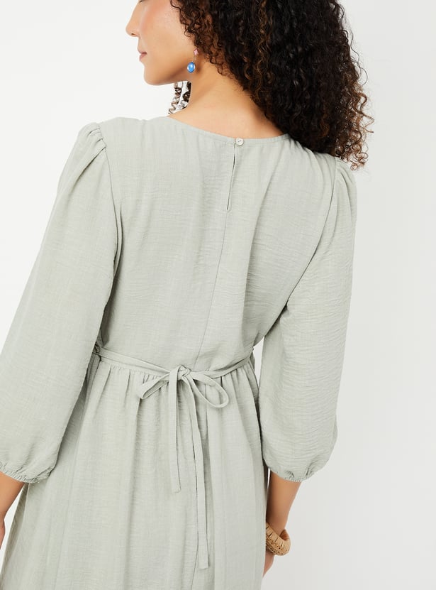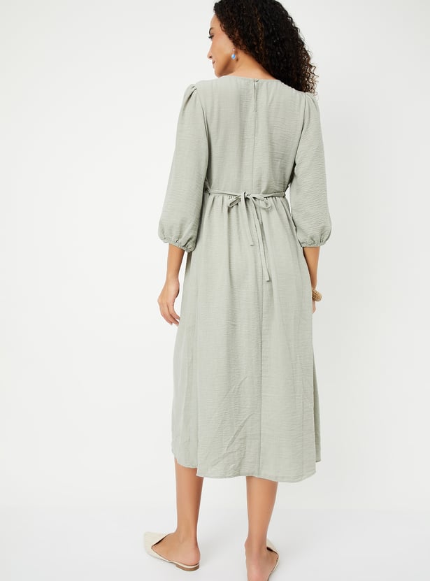 Step into effortless elegance with this dress. Designed with a flattering midi profile, it offers a sophisticated yet comfortable fit. The hammered texture adds a subtle depth to the fabric, while the delicate crochet embroidered yoke creates a beautiful, feminine touch. With a flattering V-neckline and three-quarter sleeves, this dress is perfect for both casual and semi-formal occasions. b>Model Size :