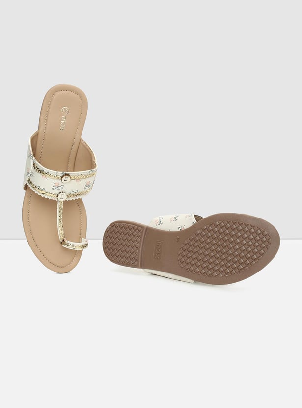 Take your ethnic or fusion styles to new heights with this pair of sandals. It features a toe ring, T-strap, braided detailing, floral prints, a padded footbed, and a durable outsole.