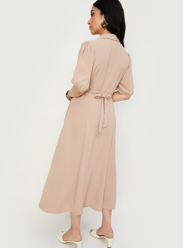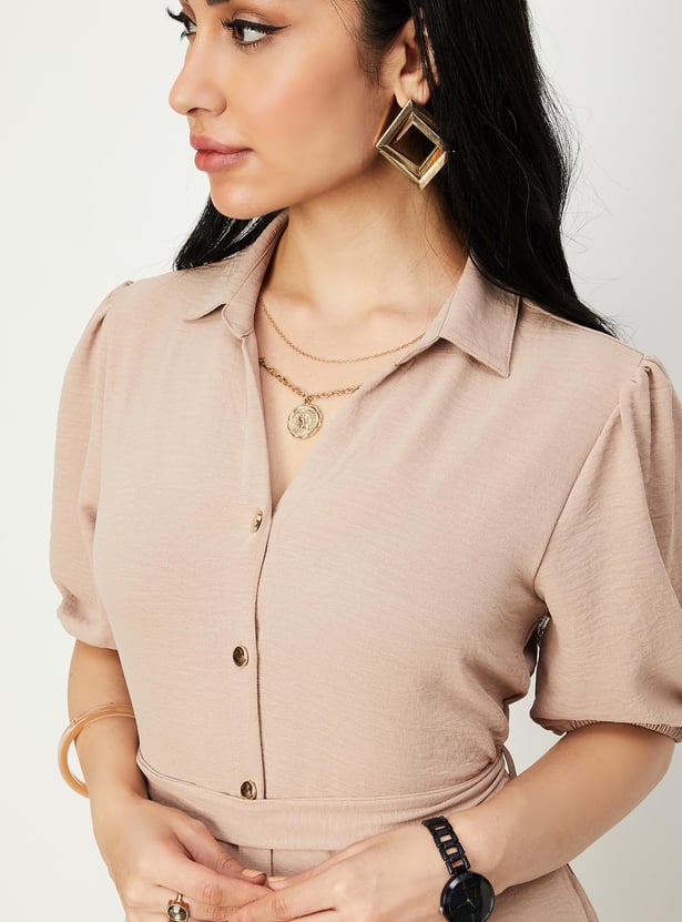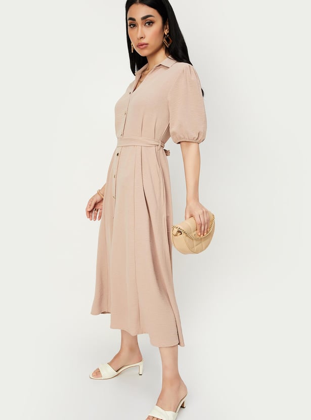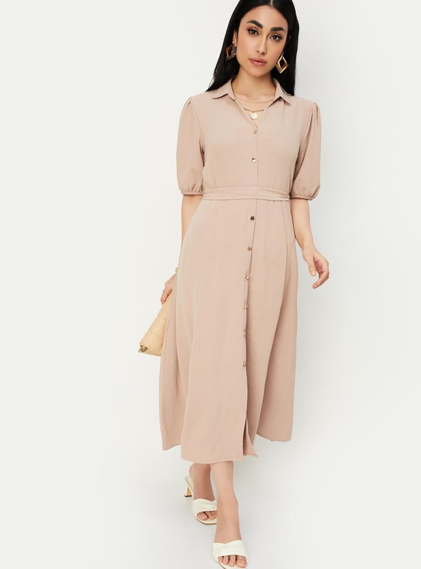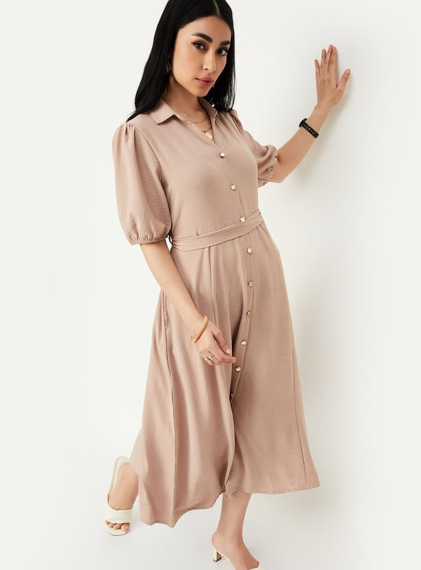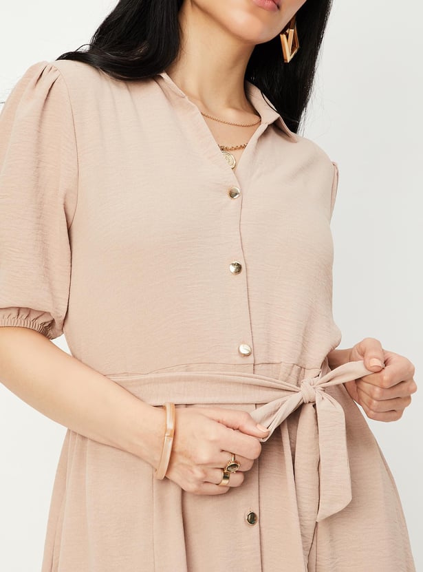 Become a highlight of any casual event with this stunning shirt dress. It is defined by a solid surface, spread collar, half sleeves, self-fabricated waist tie, and button-down closure.