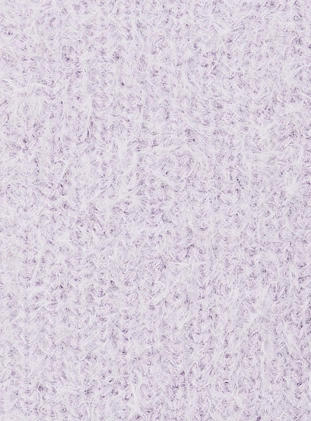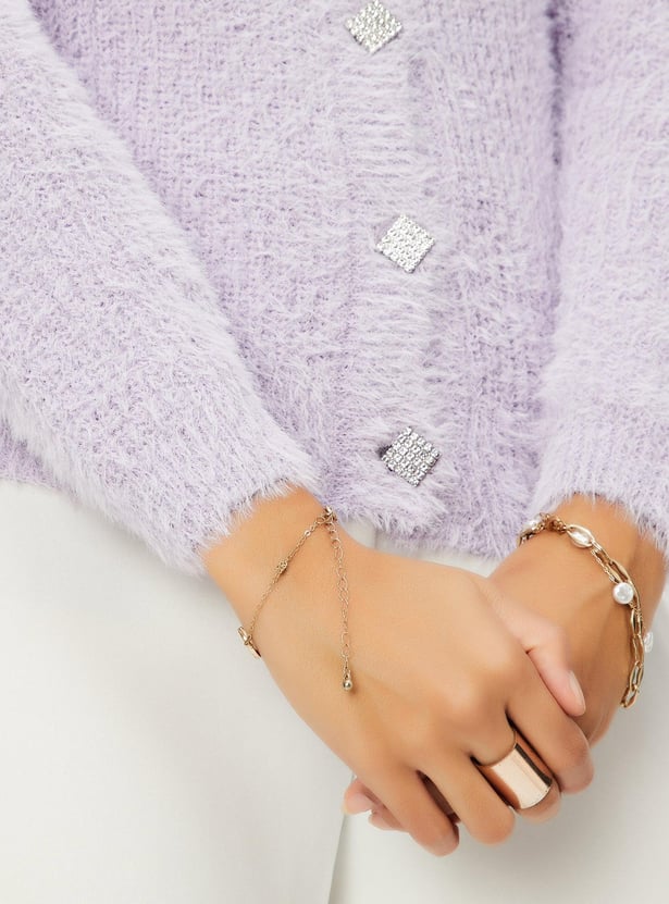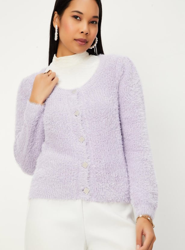 Prepare for winter with this furry cardigan that has a V-neck, full sleeves, and embellished buttons. For a warm look, pair it with some pants and sneakers.