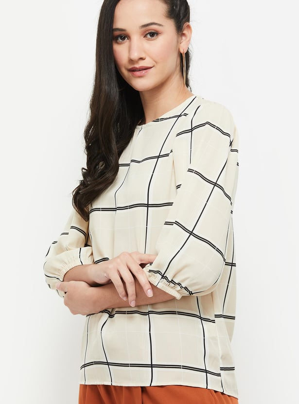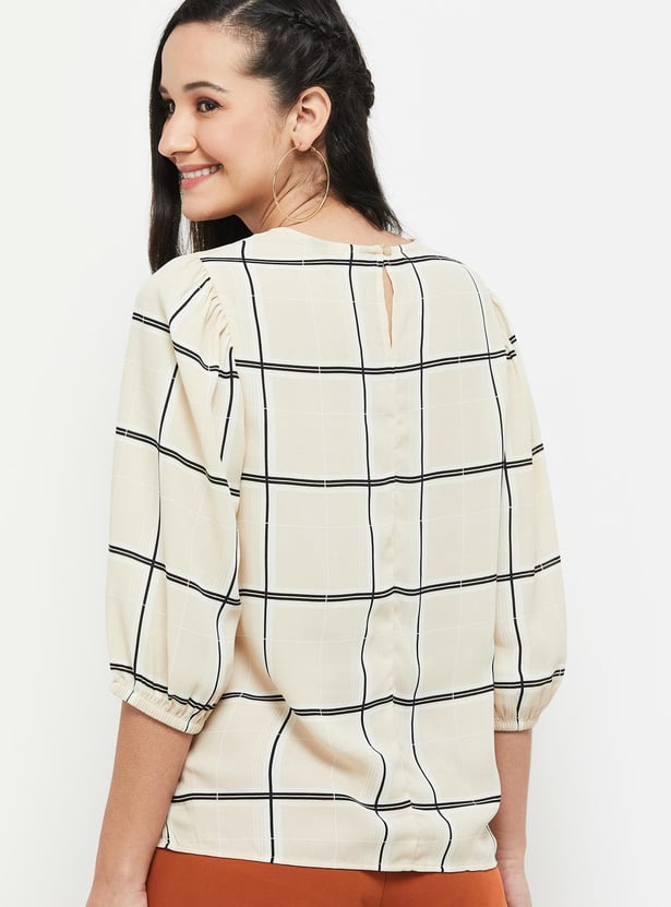 An ideal pick for a casual wardrobe, this top is designed with bold checks, three-quarter sleeves, and a round neckline.