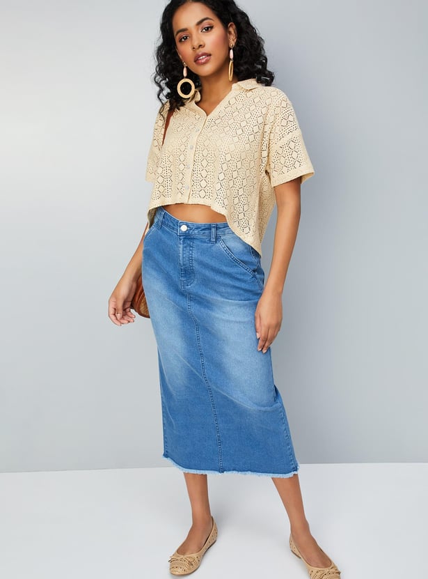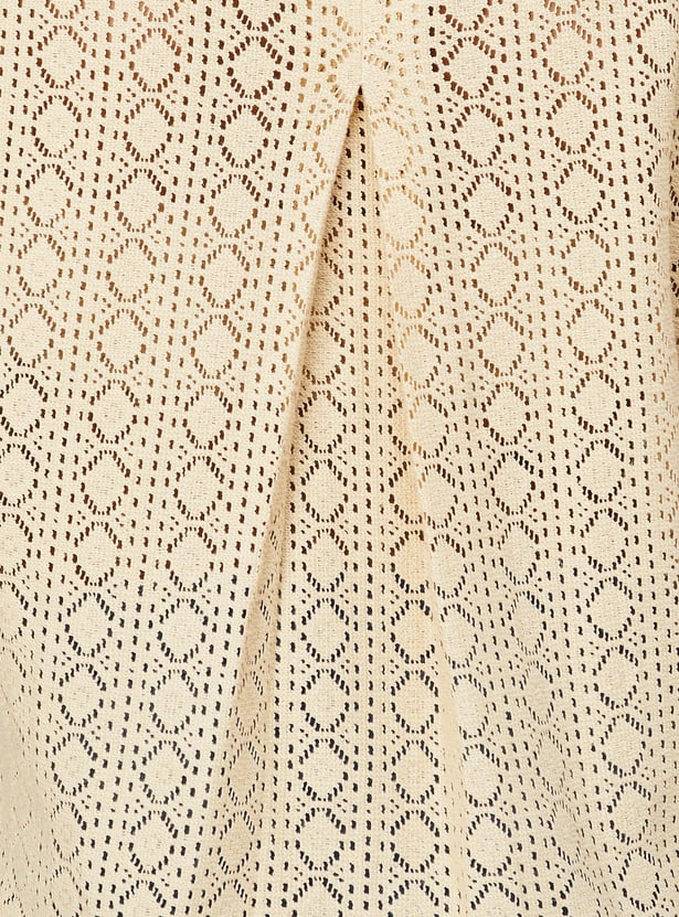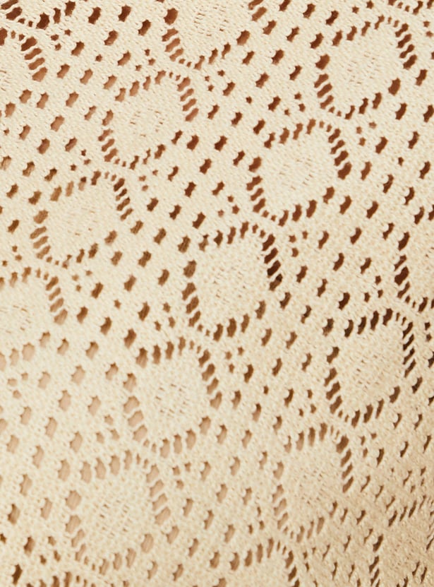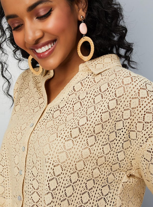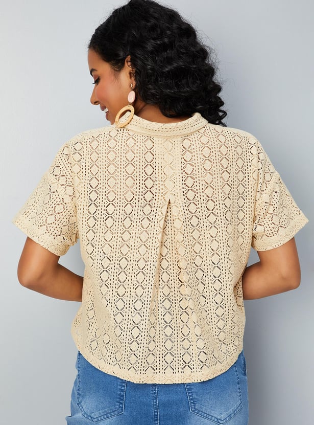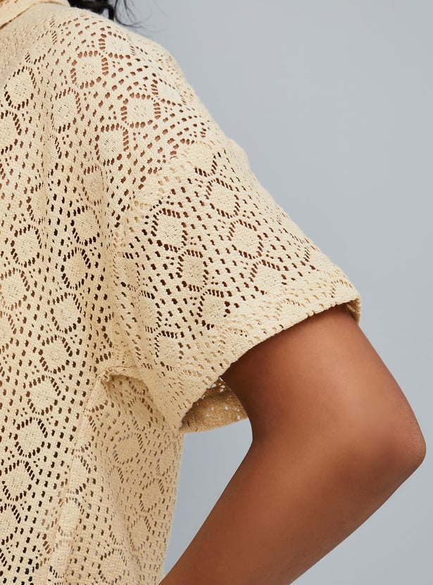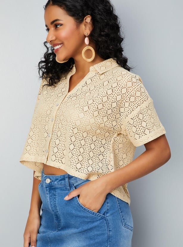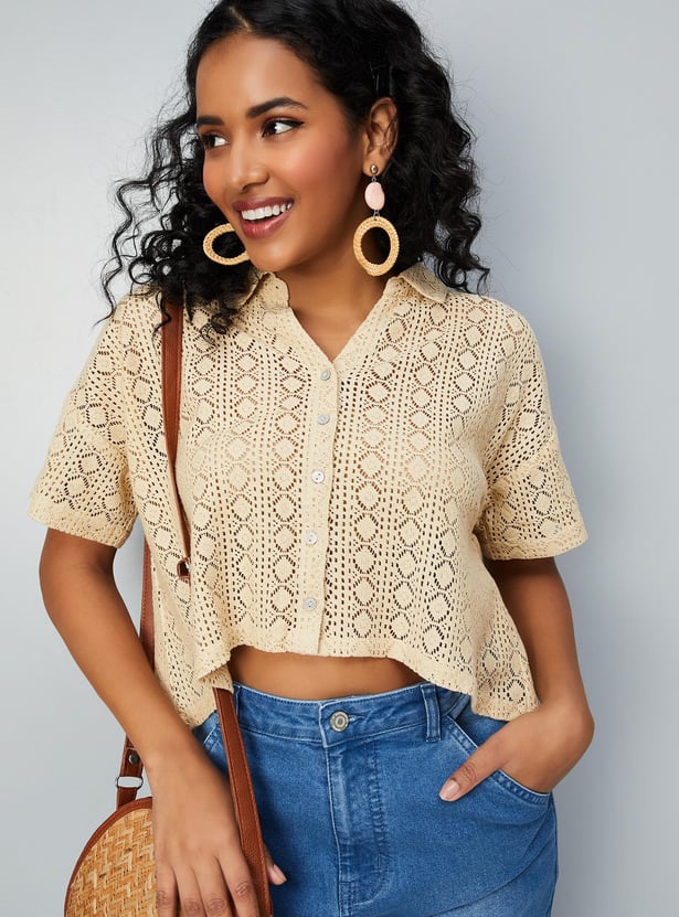 Relaxed, breathable, and stylish, this crochet shirt-style top is designed for all seasons. It has a spread collar, drop shoulders, half sleeves, and a crop length profile.