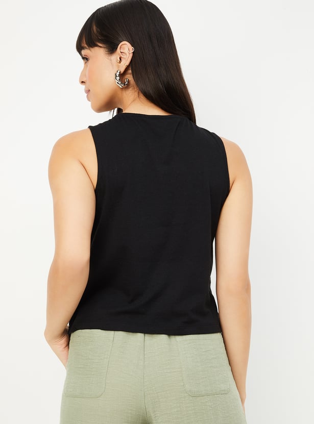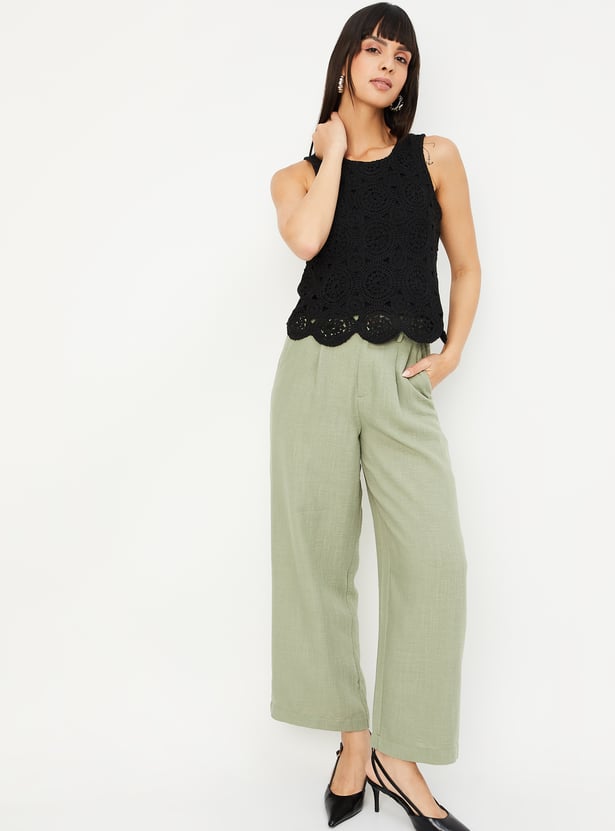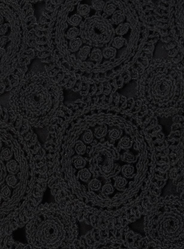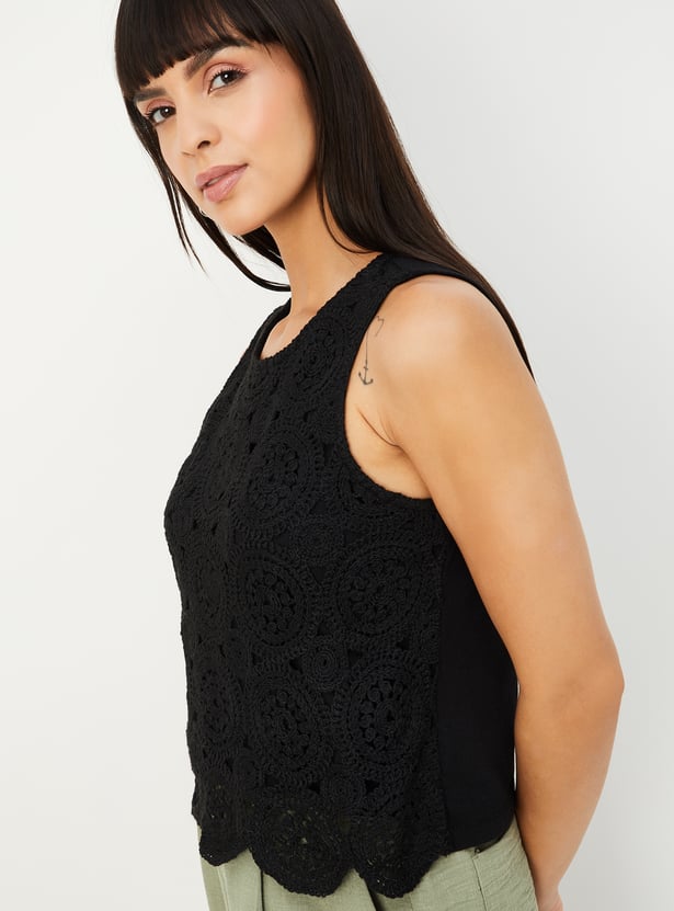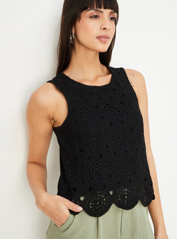 Add a delicate touch to your wardrobe with this crochet embroidered top. Featuring a round neck, sleeveless design, and a straight hem, it offers a beautiful blend of intricate detailing and modern style.