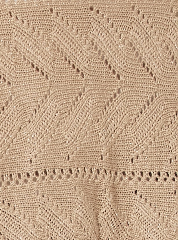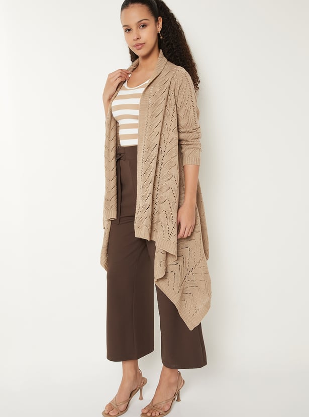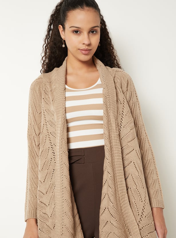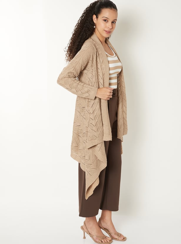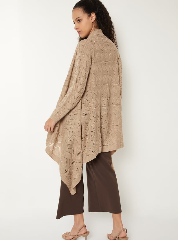 Add a touch of elegance with this crochet waterfall shrug, featuring an open front, full sleeves, and a graceful longline length. Its flowing silhouette makes it the perfect layering piece for versatile styling.