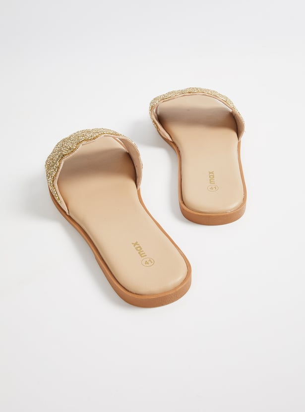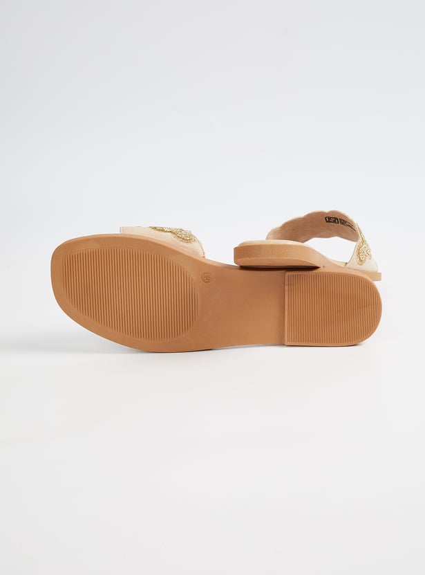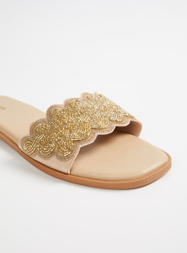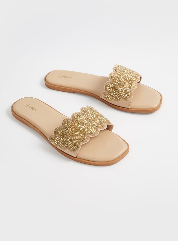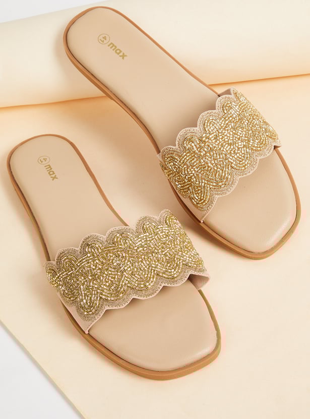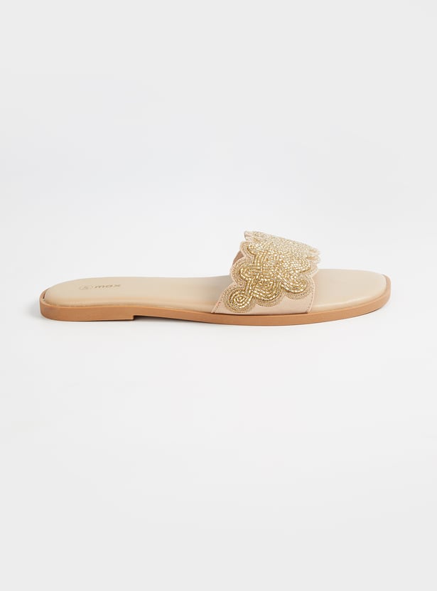 Step out in chic comfort with these embellished flats. Designed with an open toe and a modern square toe silhouette, they blend elegance with everyday ease. The embellishments add a touch of sparkle and sophistication.