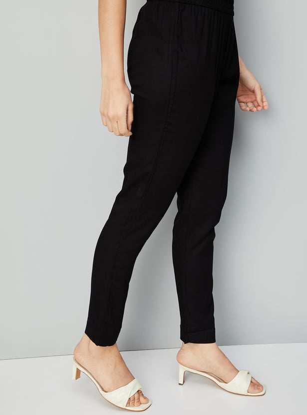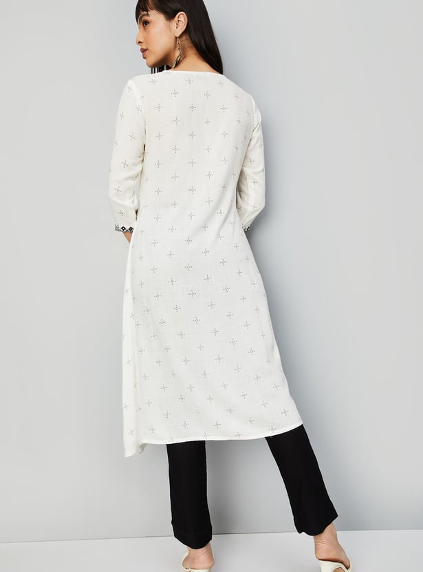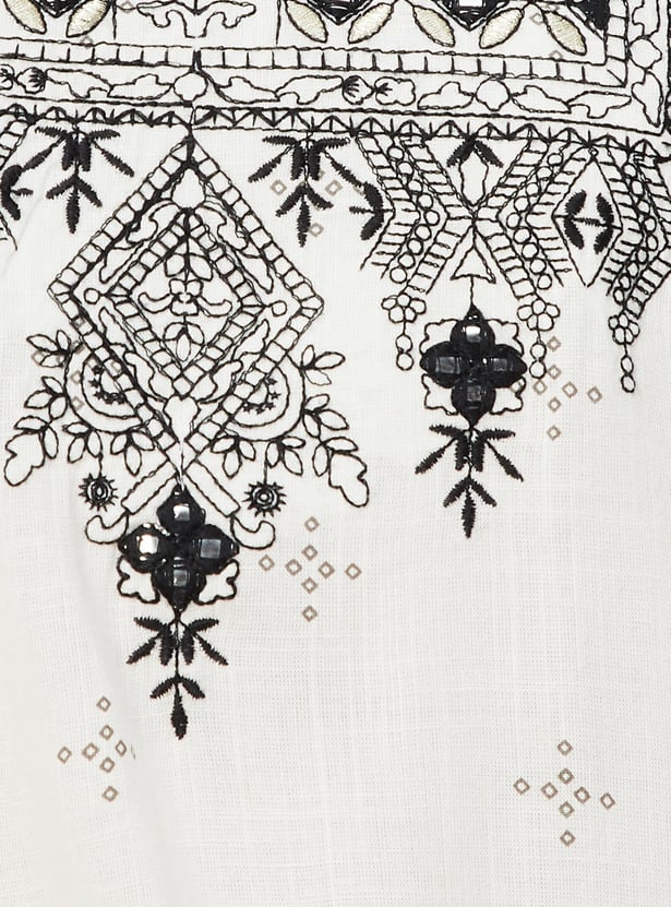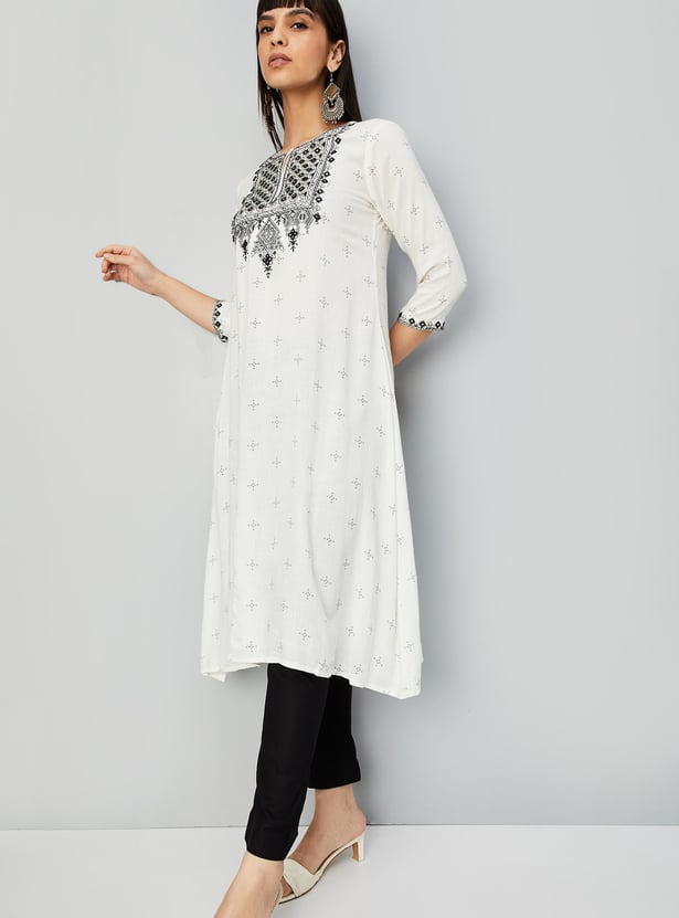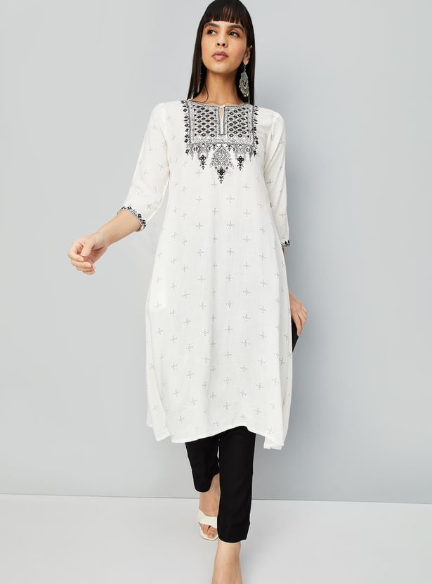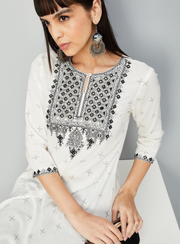 Flaunt a look of elegance in this ethnic set. It has an A-line kurta with a keyhole neckline, three-quarter sleeves, and embroidery on the yoke. A pair of straight pants with an elasticated waist completes this set.