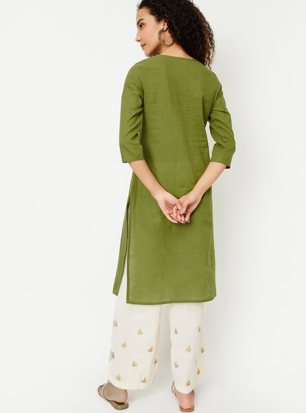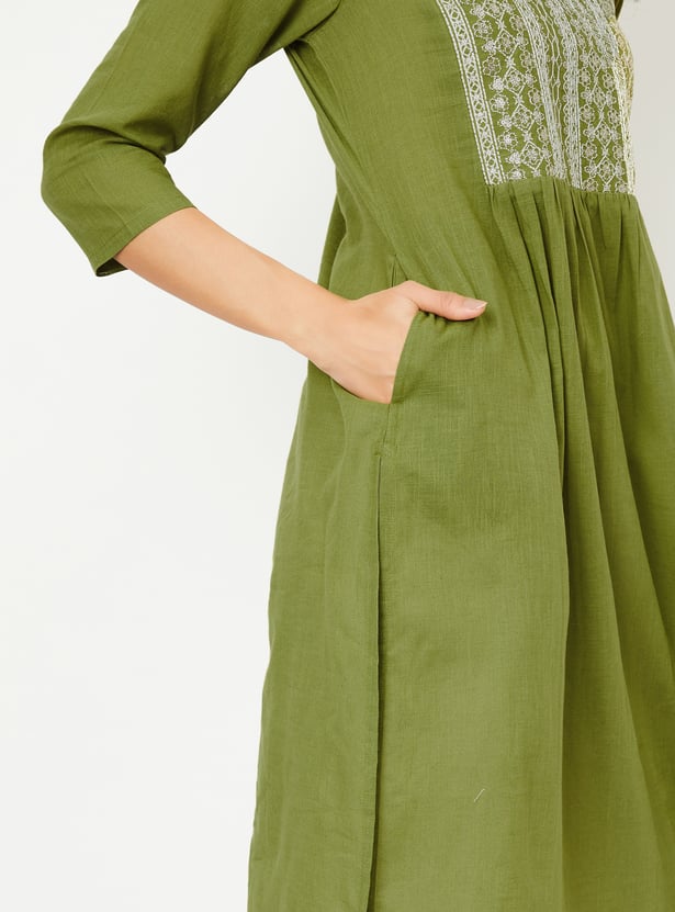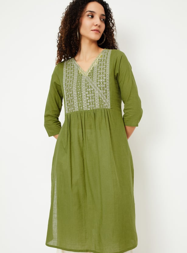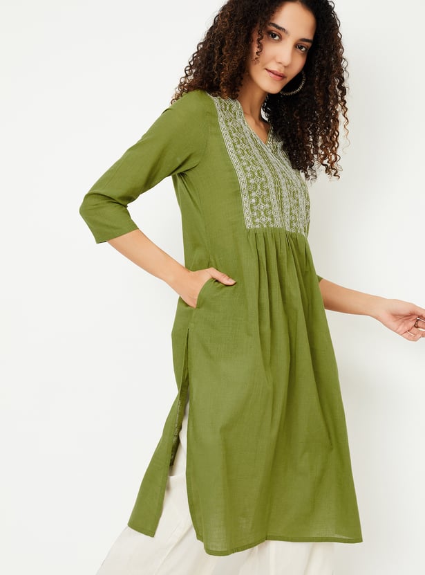 Give your everyday wardrobe an elegant upgrade with this kurta. The embroidery at the yoke adds a striking look. It is designed with a V-neck, gathered waist, and three-quarter sleeves.