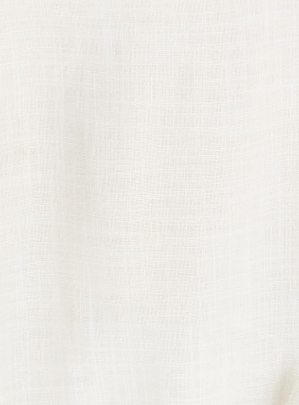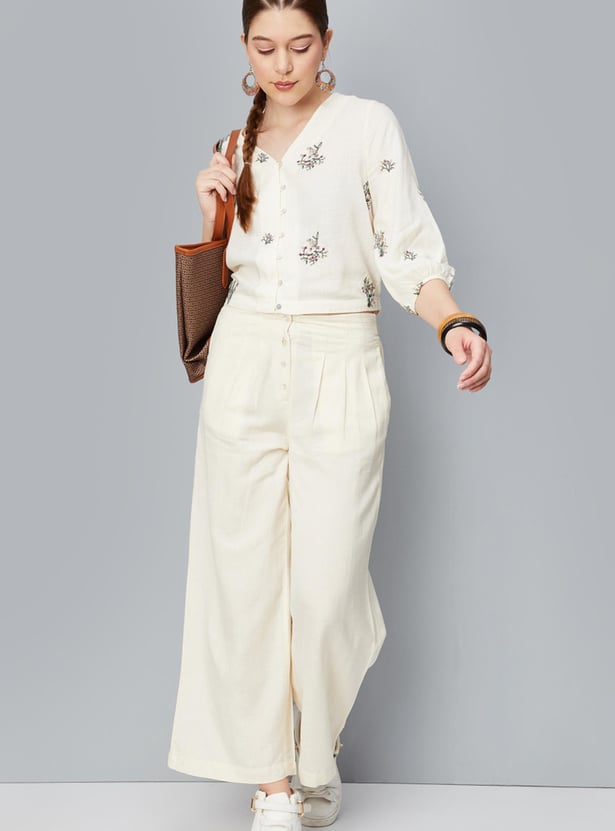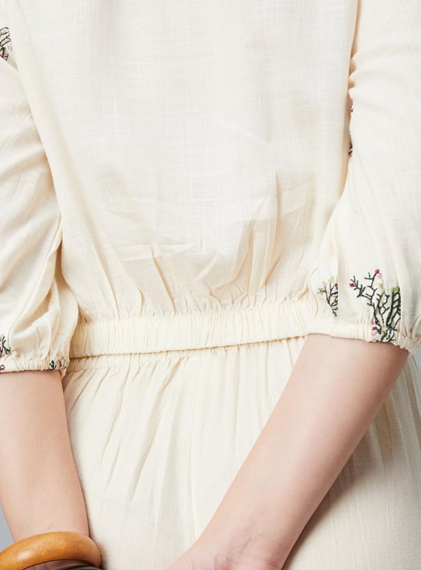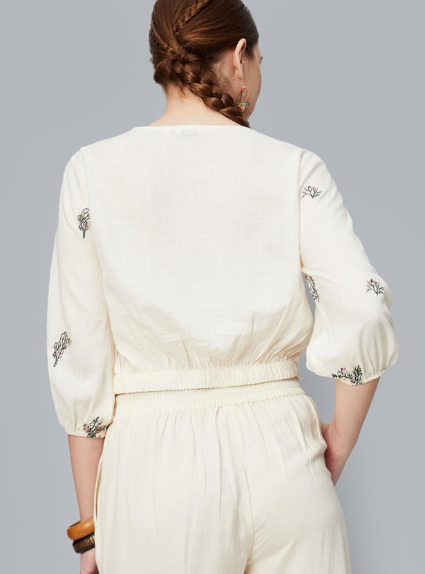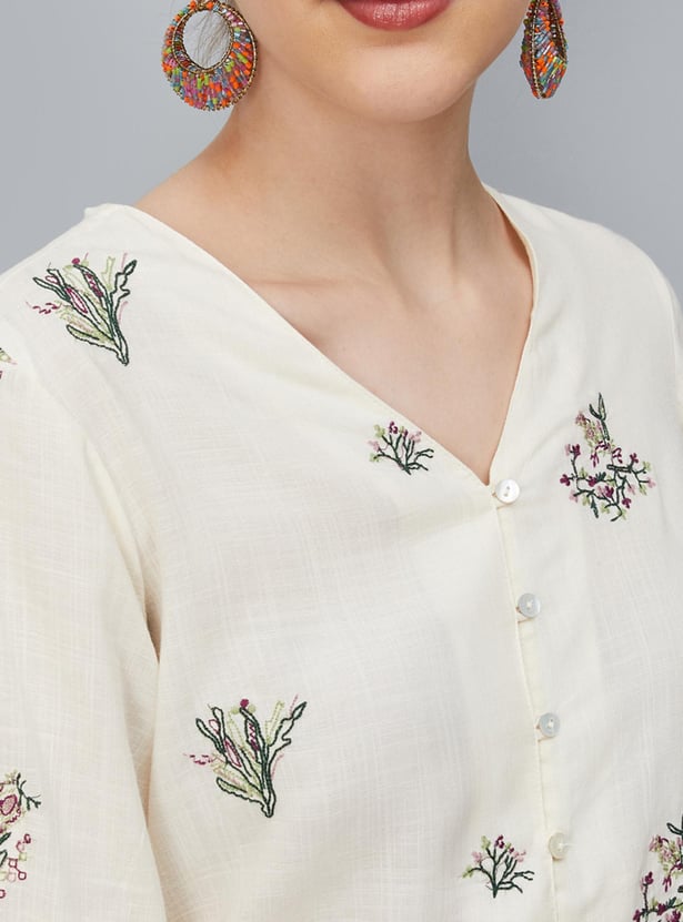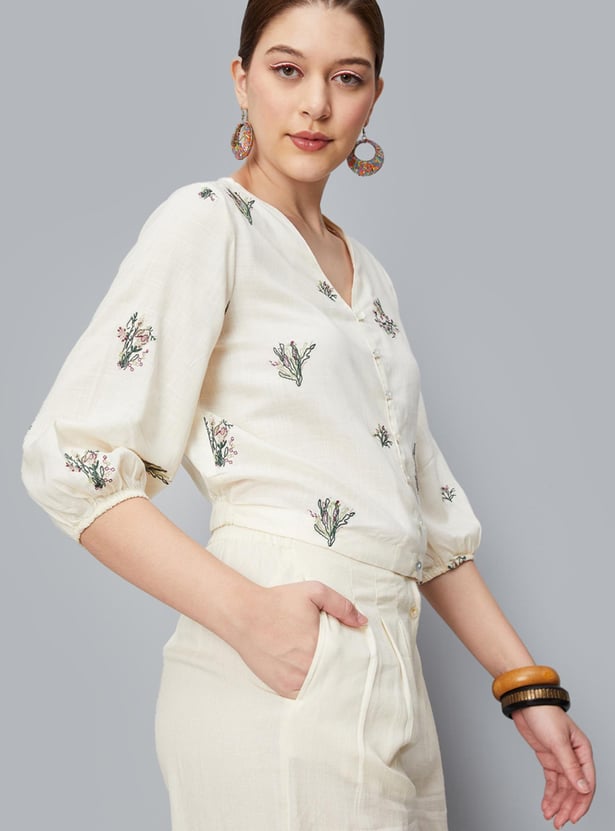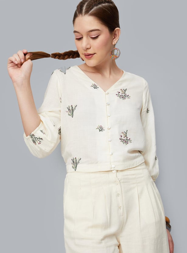 An epitome of sartorial elegance, this crop top is updated with all-over embroidery. It is designed with a V-neck, bishop sleeves, a button-down front, and a partially elasticated hem. Style this top with a pair of palazzos and sneakers to ace the look.