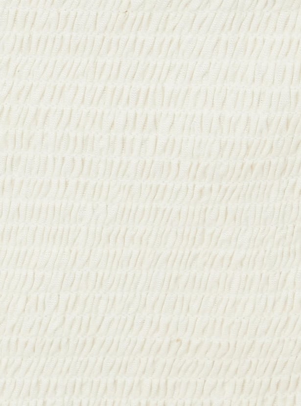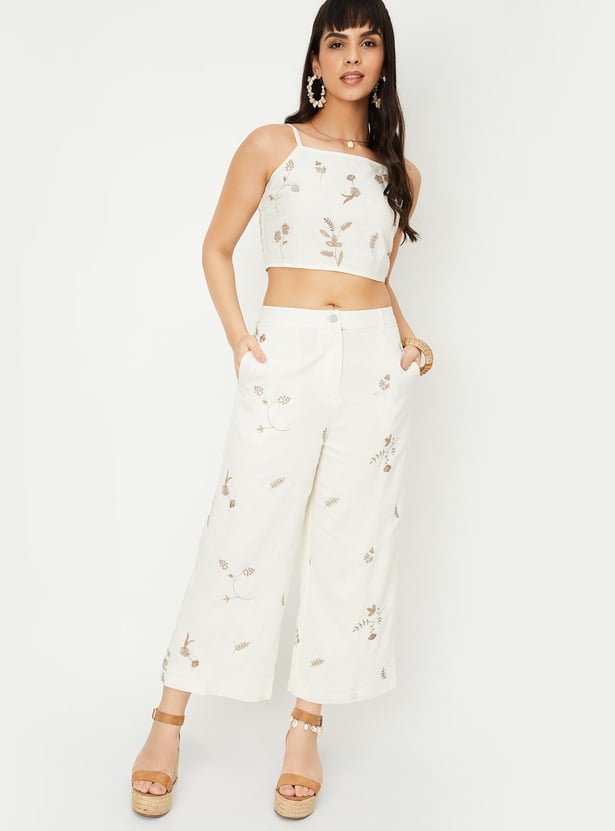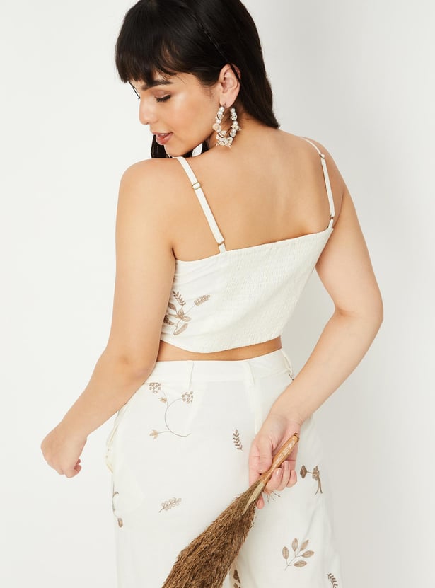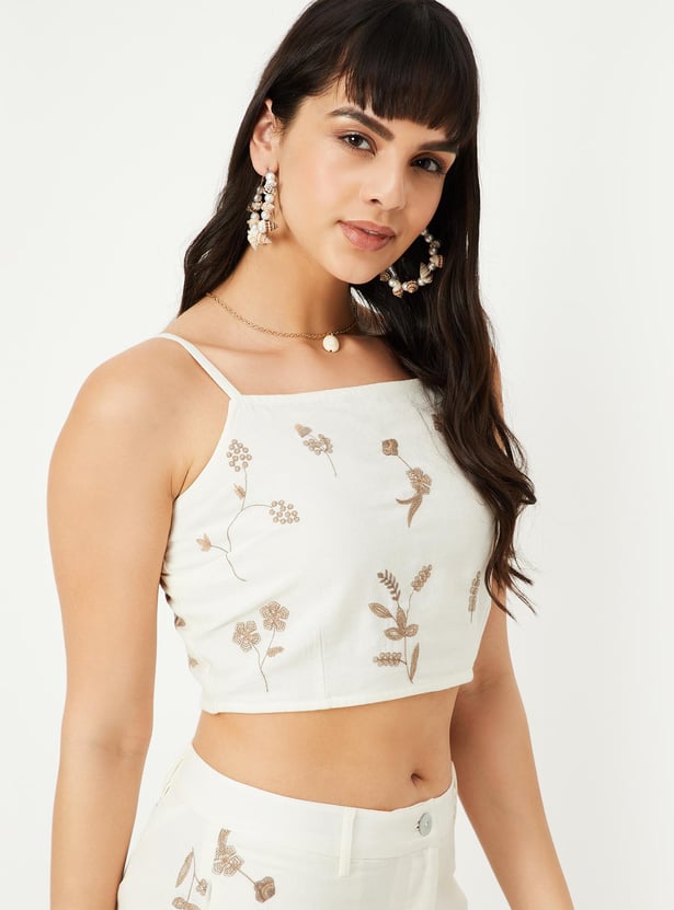 Give a makeover to your wardrobe with this trendy and stylish crop top. It is designed with an embroidered surface, square neckline, and strap details. Team it with a pair of trousers and heels to make your outfit look elegant.