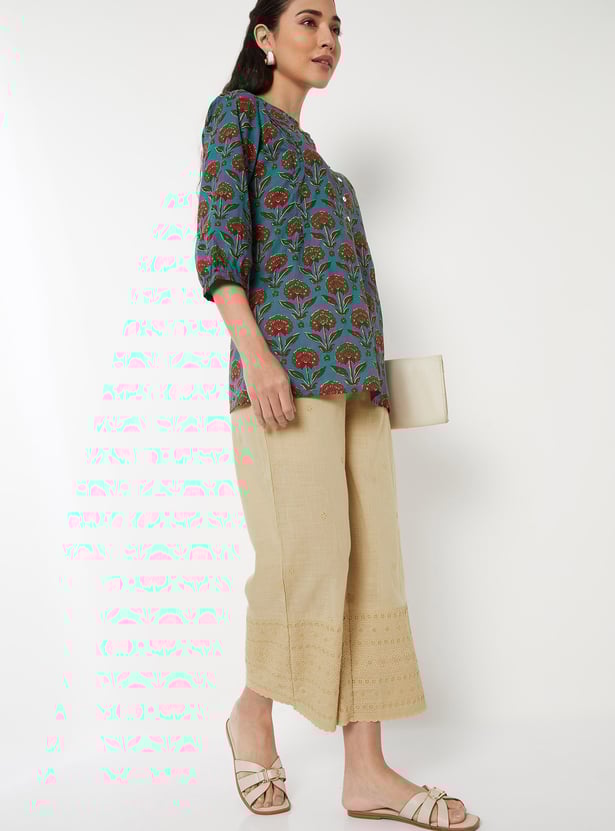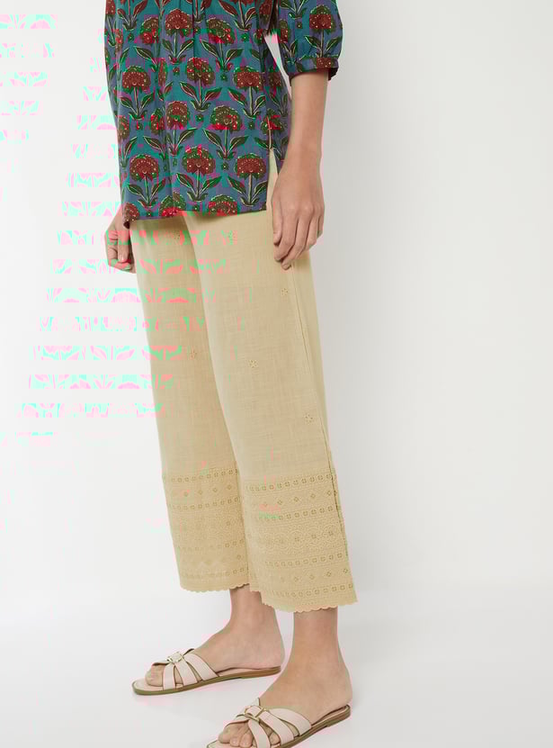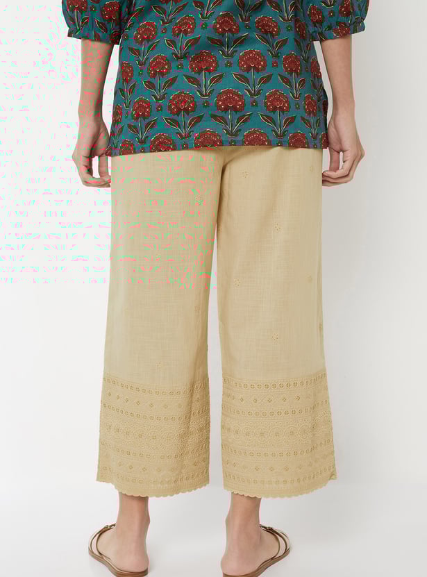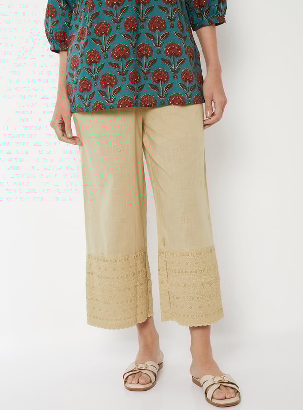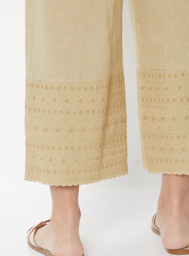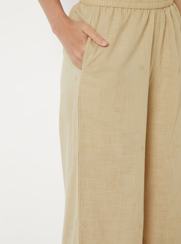 Stay effortlessly chic with these embroidered hem palazzos. Designed with an elasticated waist for comfort and ease, they also feature practical pockets, making them both stylish and functional.