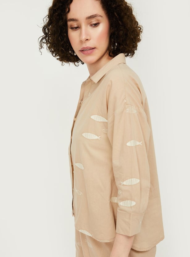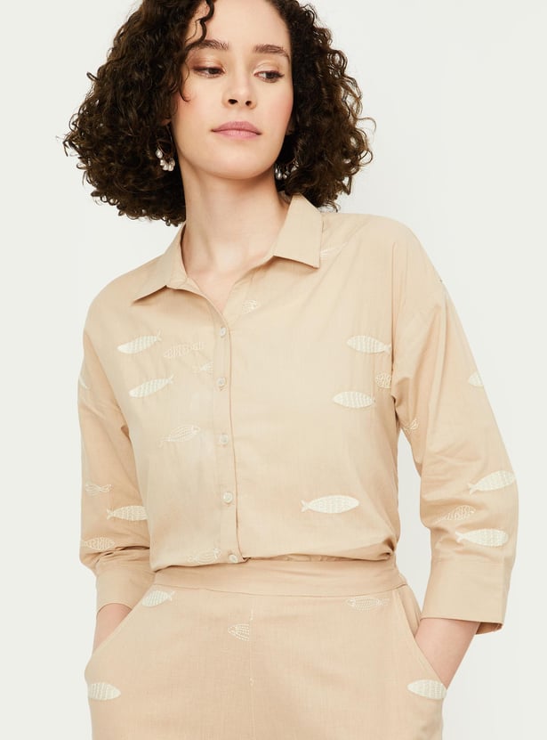 Skip into summer in style in this shirt. It is updated with fish embroidery all over. It is fashioned with a collared neck, three-quarter sleeves with buttoned cuffs, and a high-low hem.