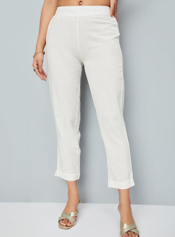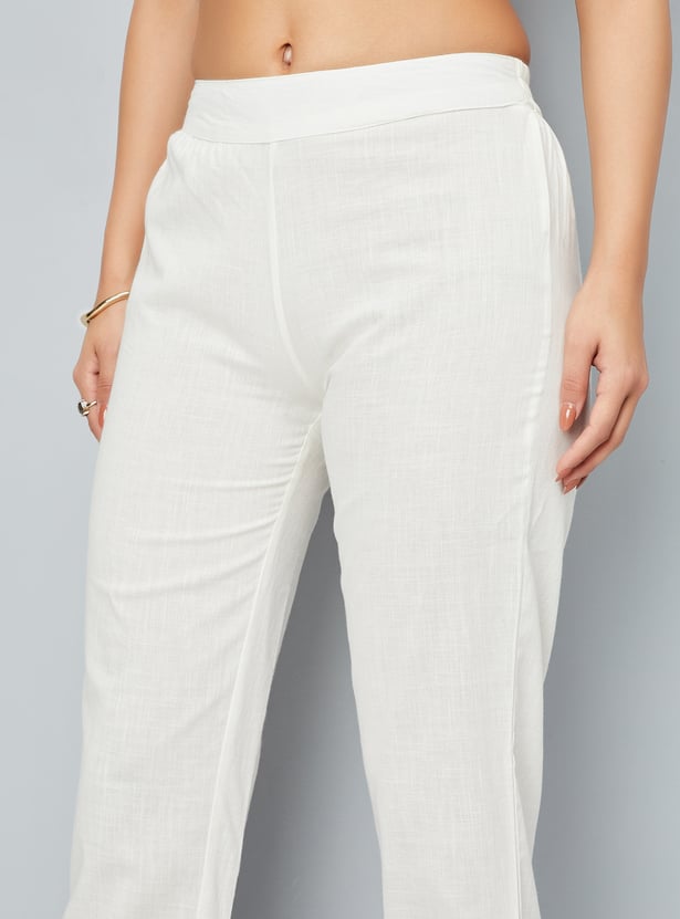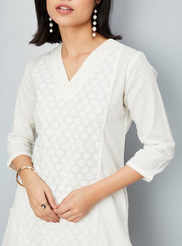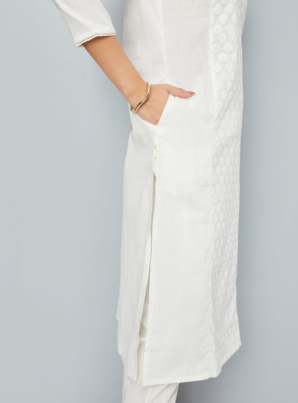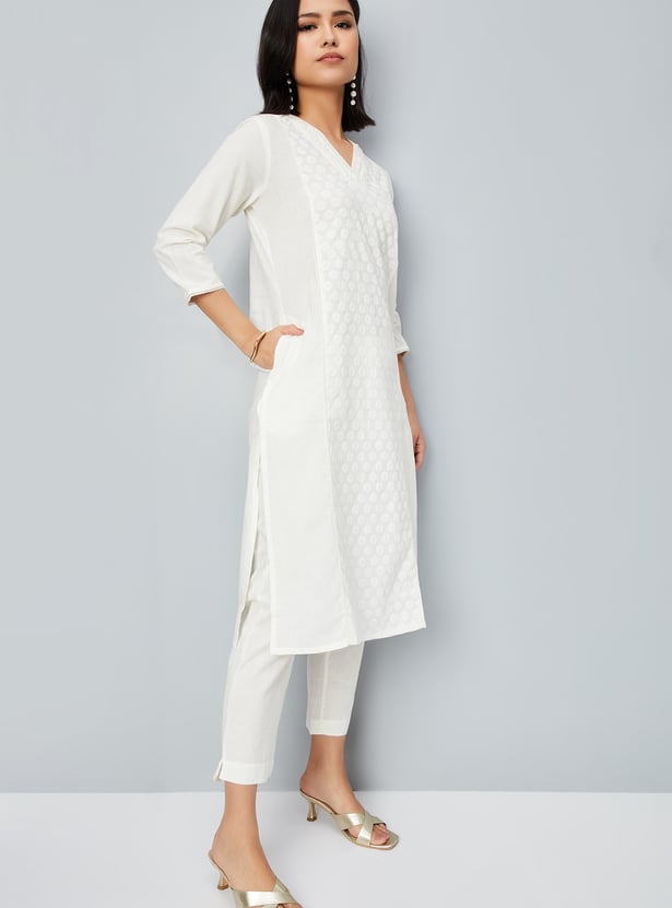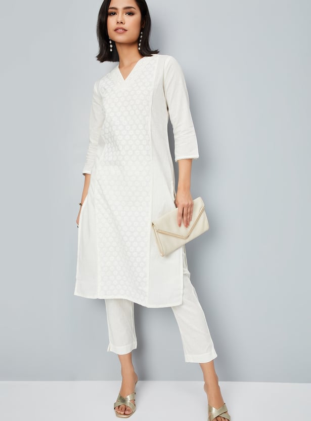 Looking to level up your wardrobe? This embroidered straight kurta set strikes the perfect balance of elegance and comfort. With a flattering V-neck with lace inserts, 3/4th sleeves, front panel, and side slits, the kurta offers a chic, breezy vibe for casual hangouts or festive celebrations. It is paired with elasticated solid straight pants for a complete look.