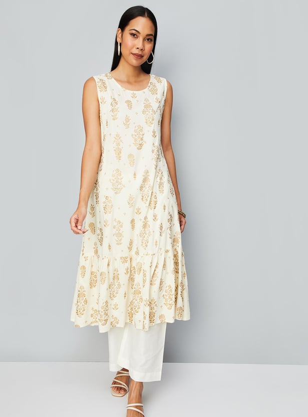 Glam up for special occasions in this layered kurta. It has a printed inner layer kurta in an A-line profile with a round neck and sleeveless construction. The outer kurta has a round neck, three-quarter sleeves and an embroidery design. Pair this kurta with leggings and heels for an elevated style.