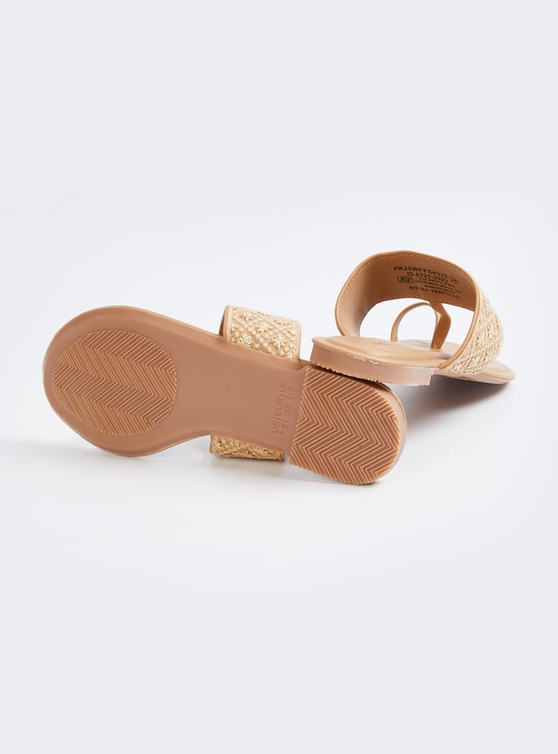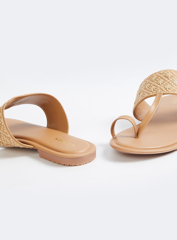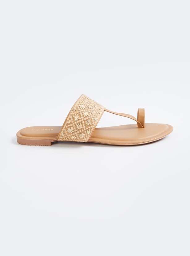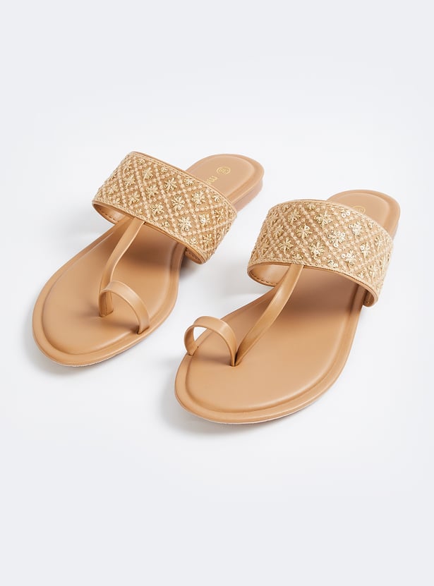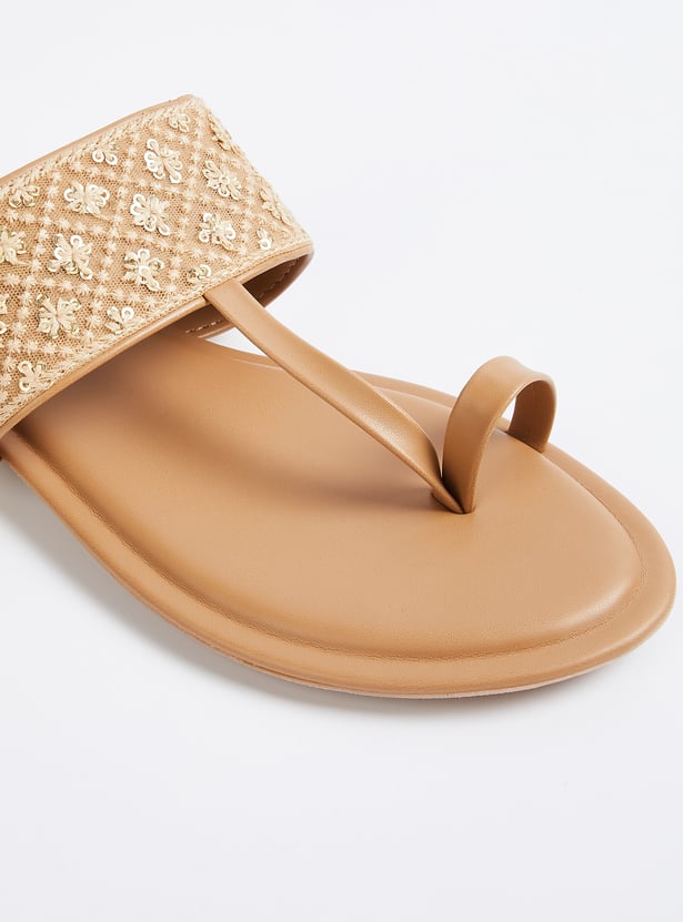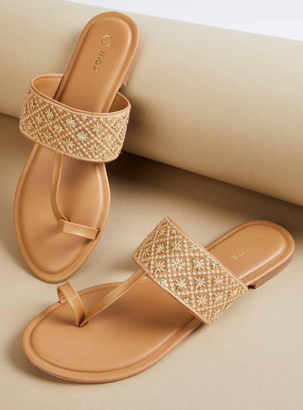 Add a touch of elegance with these embroidered one-toe flats, featuring intricate detailing for a stylish finish. Comfortable and versatile, they are perfect for both casual and festive occasions.