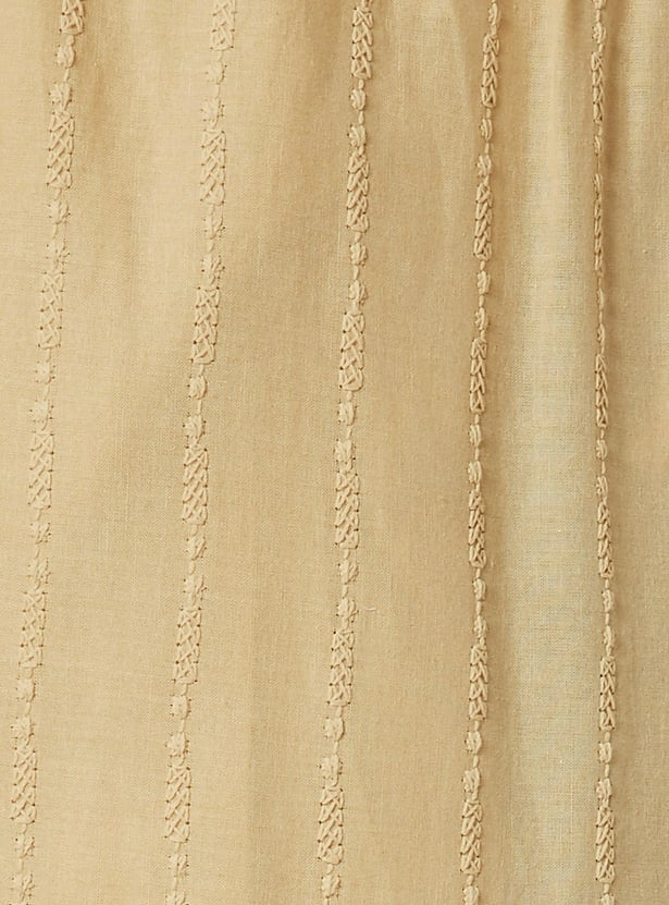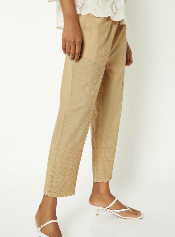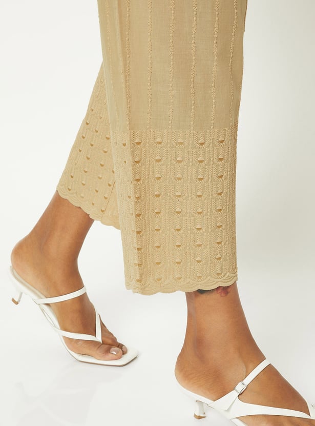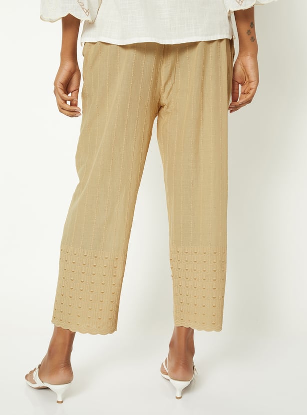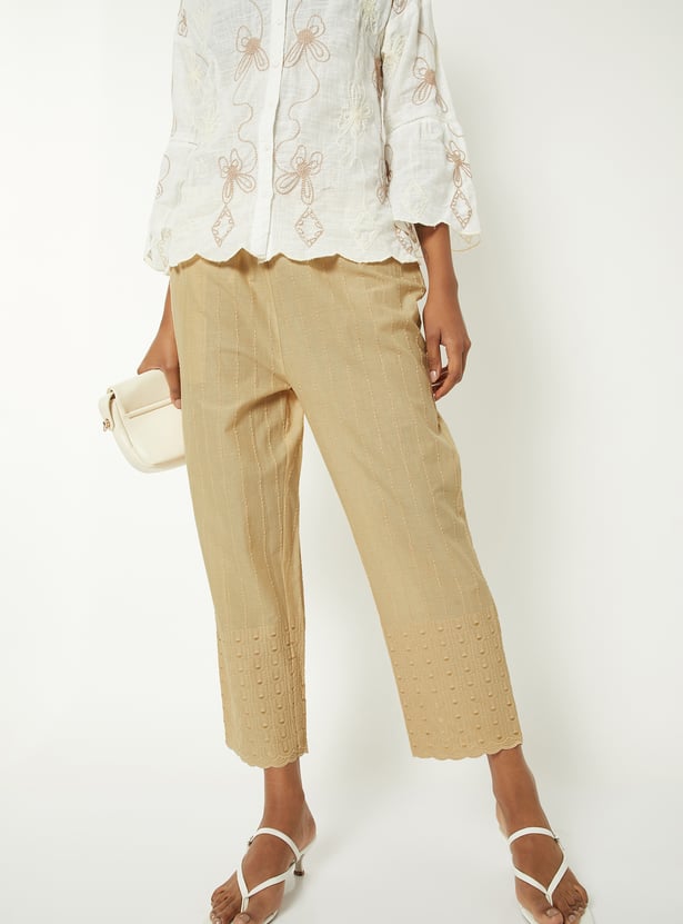 Breeze through the day in style in this pair of palazzos. It features an elasticated waist, side pockets, an embroidered panel, and a scalloped trim at the hem.