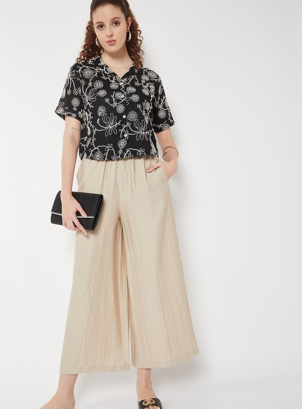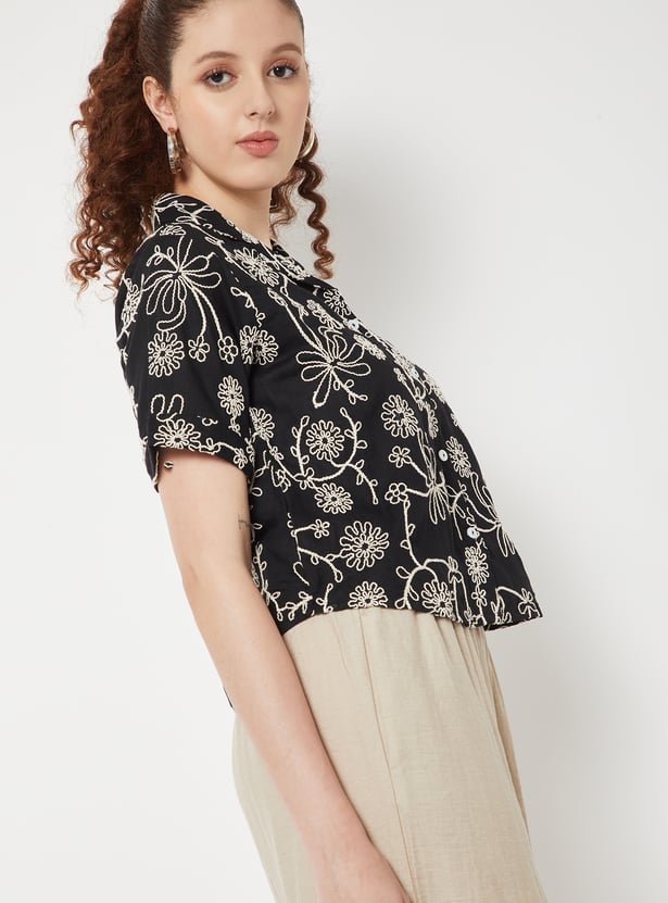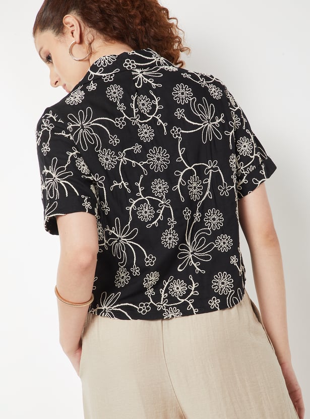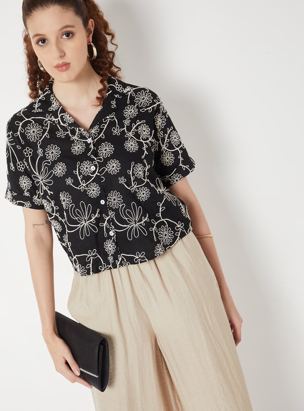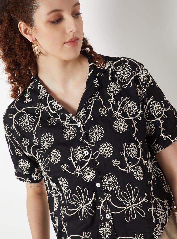Edgy and versatile, this embroidered regular fit shirt is a timeless essential for effortless dressing. Featuring a resort collar, button placket, and half sleeves, it delivers a polished yet relaxed look. Model Size :