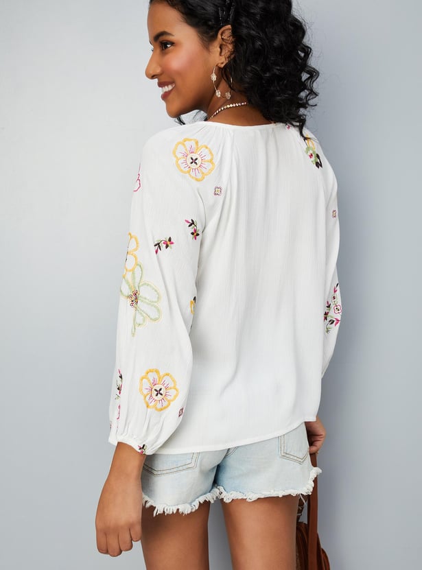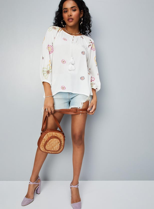 Flaunt a look of elegance in this tunic featuring a tie-up neckline, raglan sleeves, and embroidered detailing.