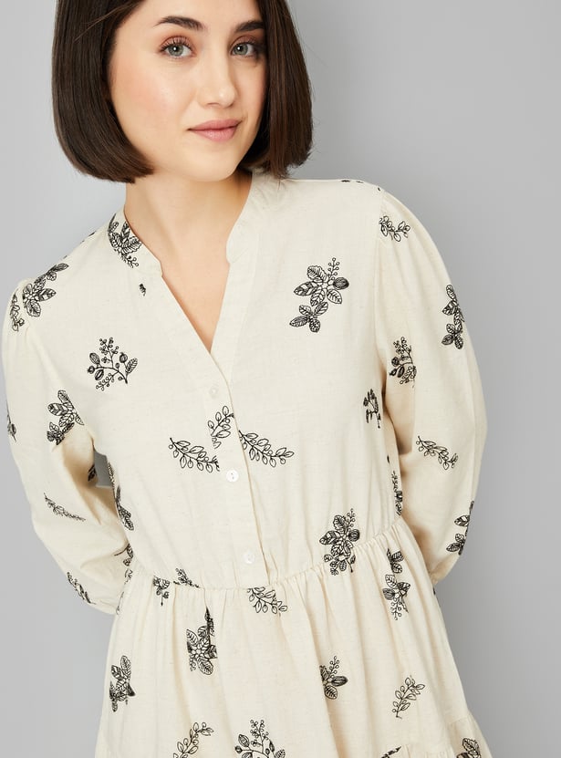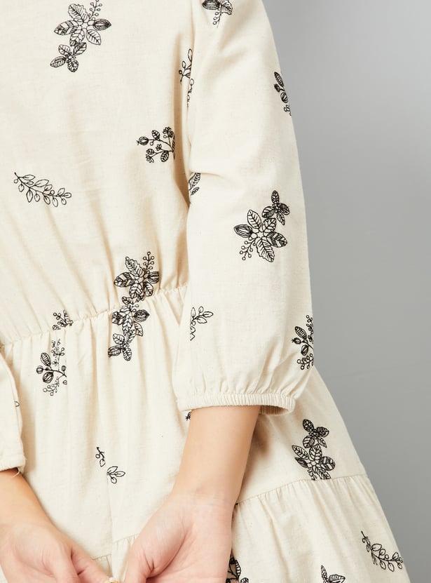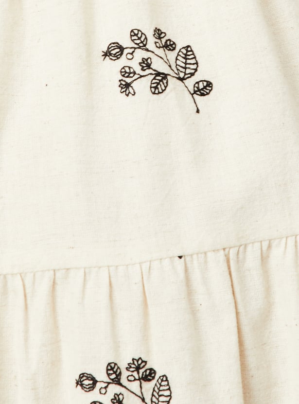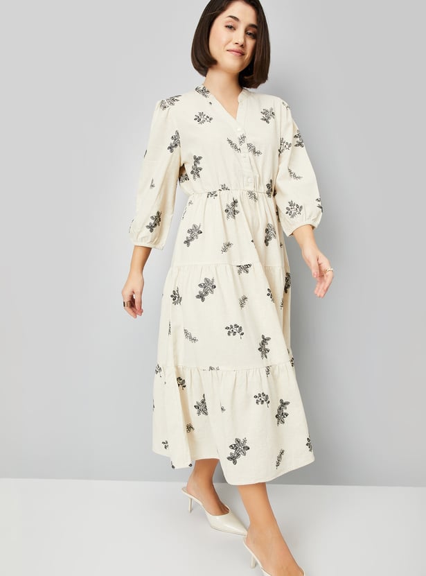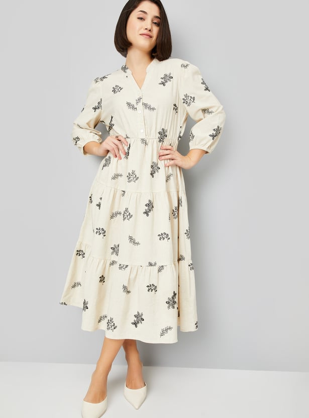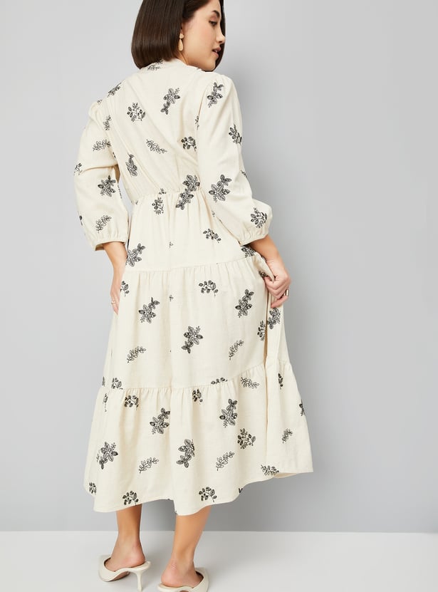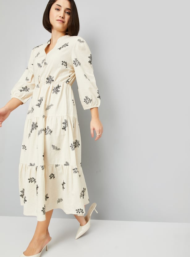Embrace elegance with this embroidered tiered dress, designed to give you a flowy, feminine silhouette. The full sleeves and mandarin collar bring a sophisticated touch, while the half button placket adds a classic detail. The maxi length and tiered design give it a flattering, effortless appeal. Model Size :