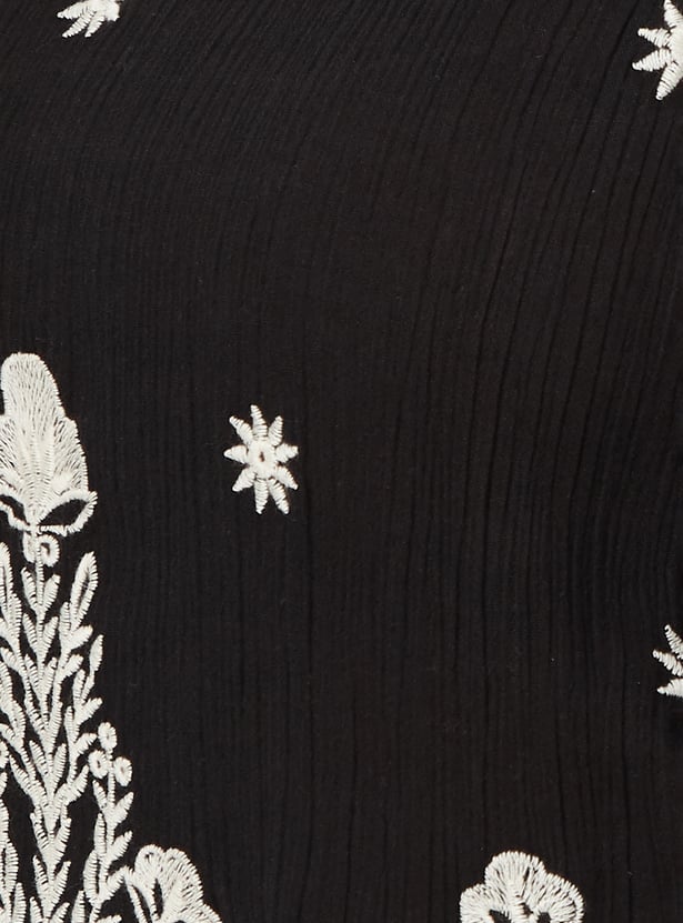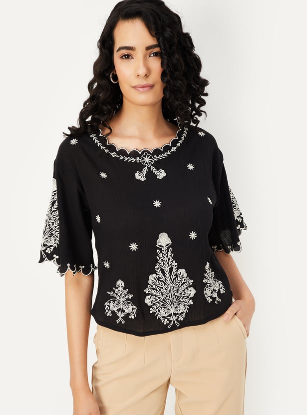 Elevate your style effortlessly with this chic top featuring a sophisticated embroidered design, scalloped neck, and trendy flared sleeves. It's the perfect choice to add elegance and flair to your wardrobe.