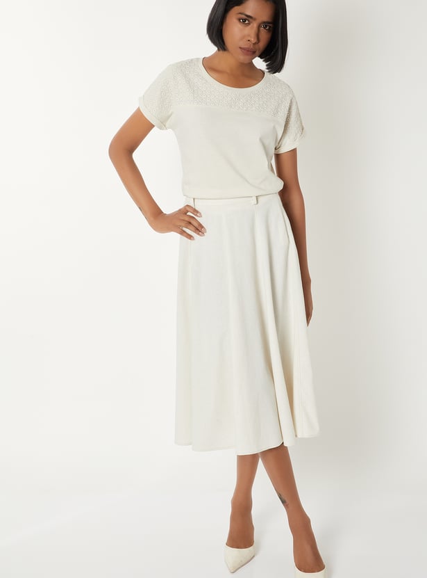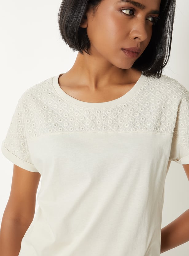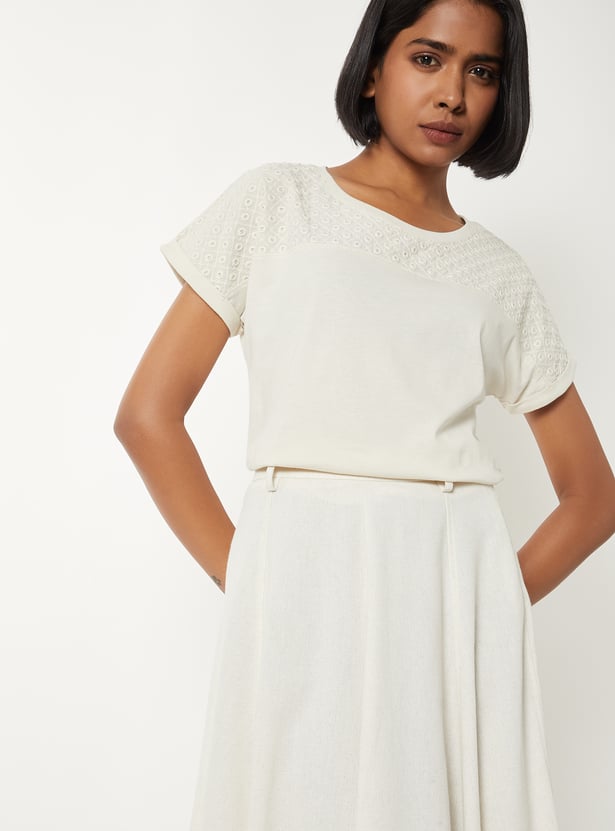 Add a touch of elegance to your look with this embroidered top featuring a round neck and extended half sleeves. Ideal for casual outings and daytime events. Model Size :