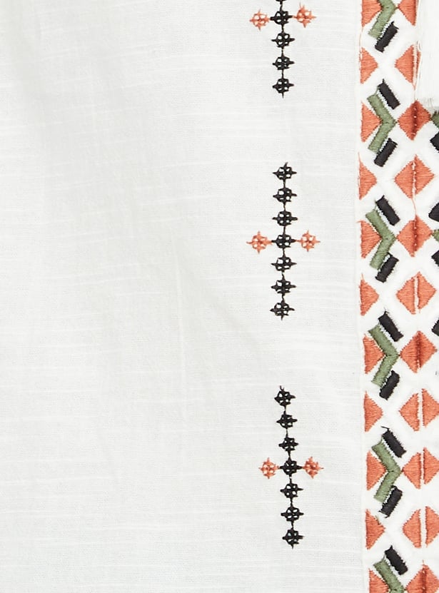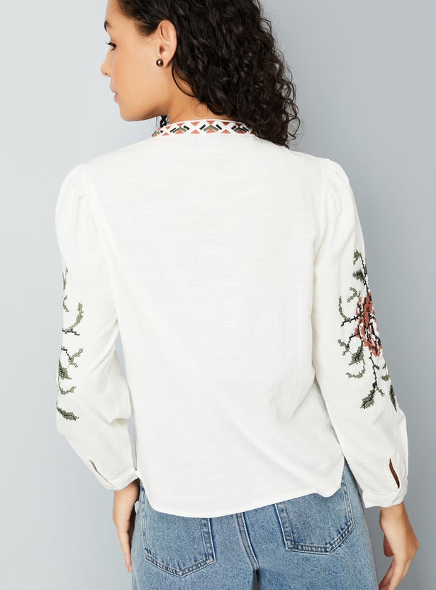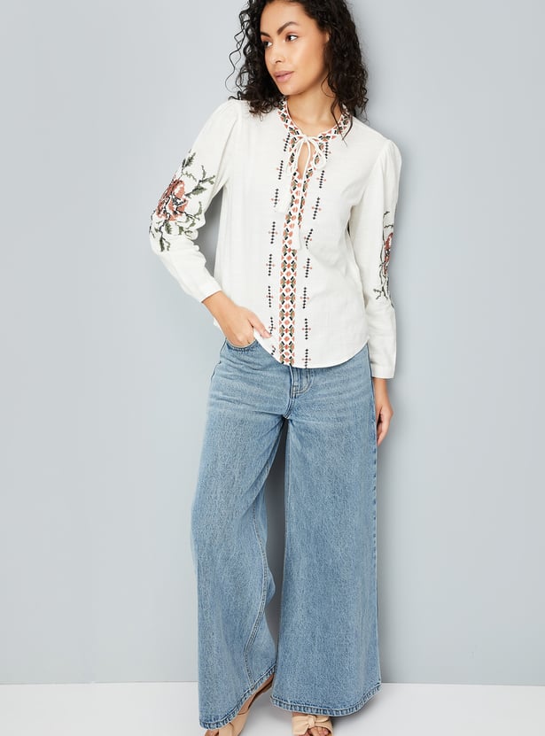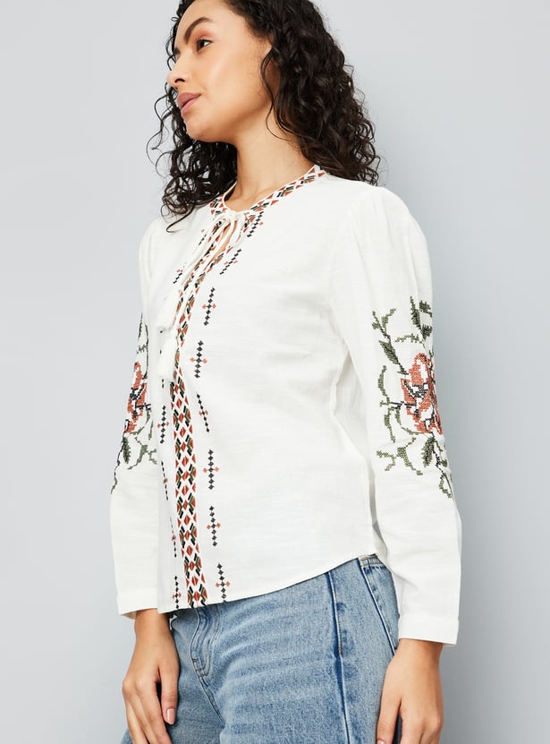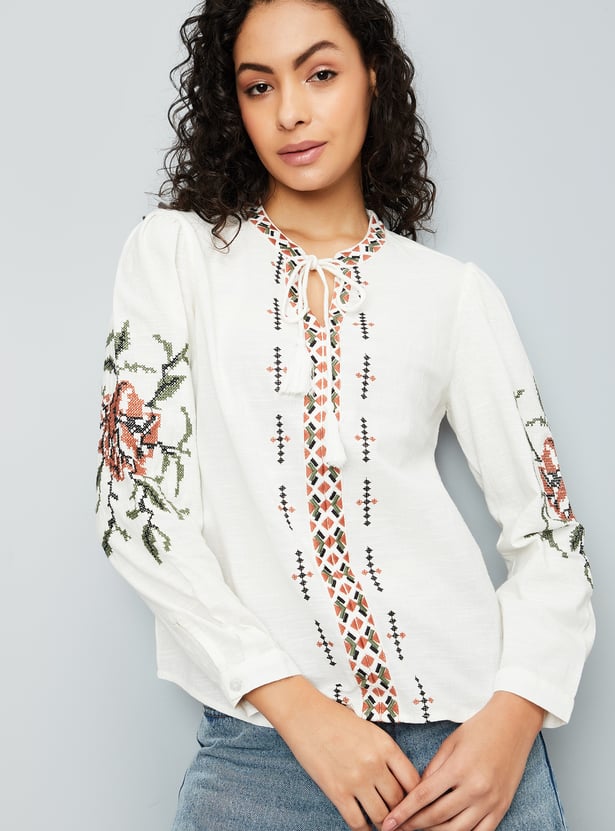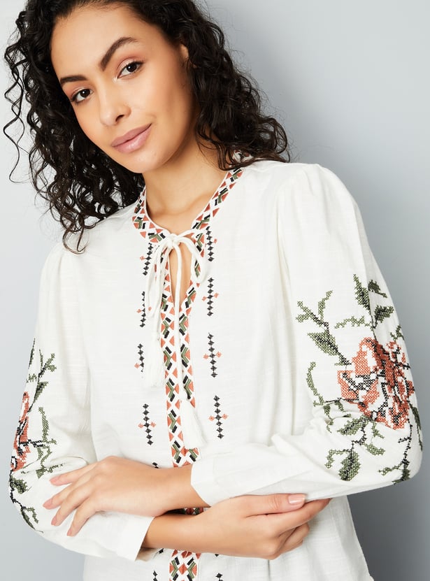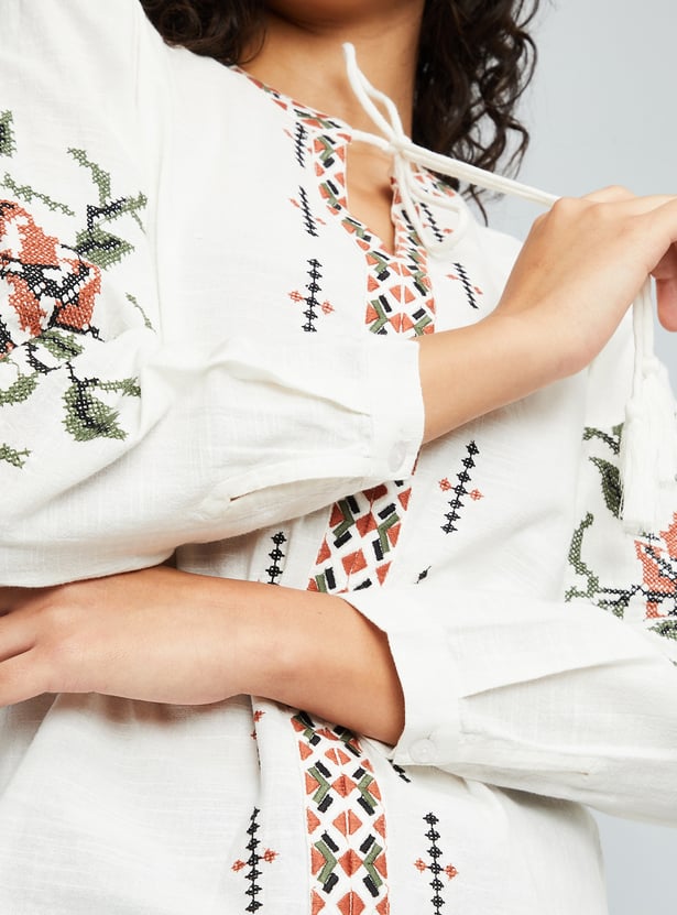 Look boho-chic in this tunic, featuring embroidered designs on the front and sleeves for an elevated touch. It has a tie-up neck, full sleeves with buttoned cuffs, and a curved hem.