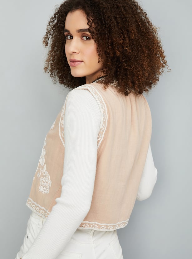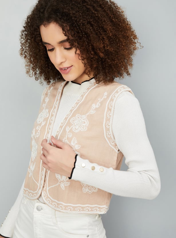 Get ready to layer in a fusion style with this sleeveless waistcoat. It ensures comfort, while delicate embroidery and an open neck add elegance. Ideal for both special occasions and everyday wear.