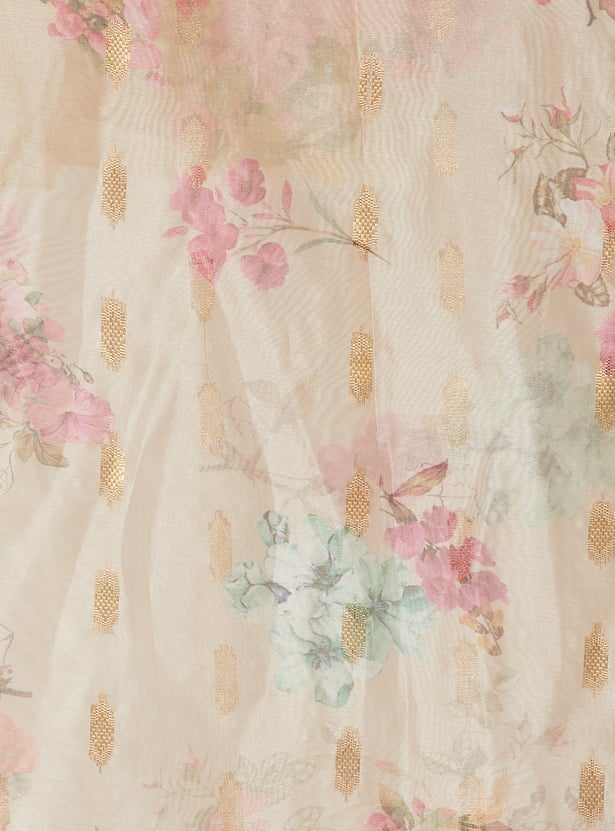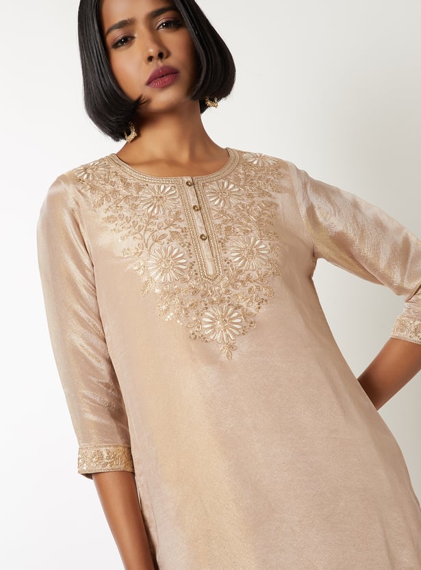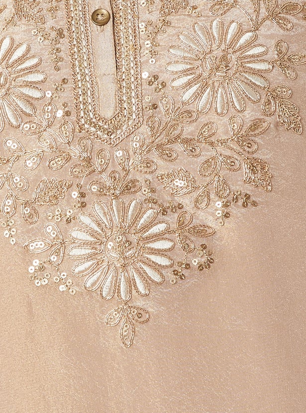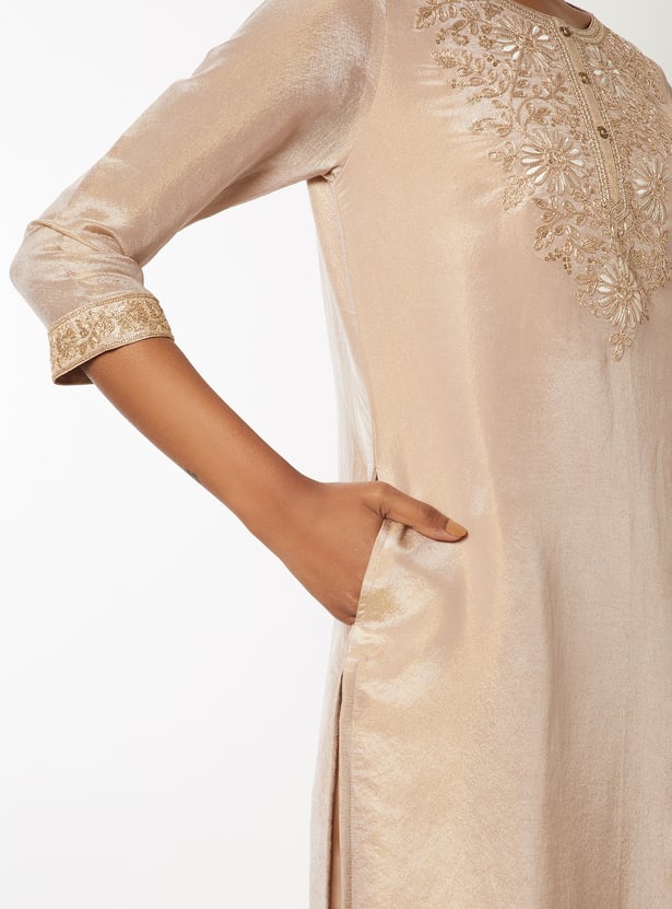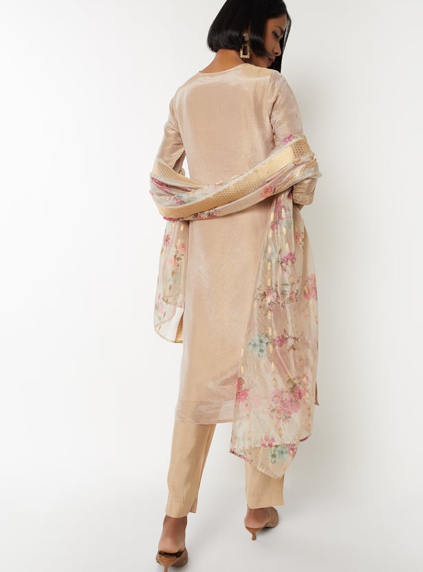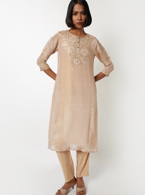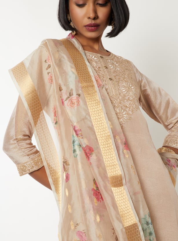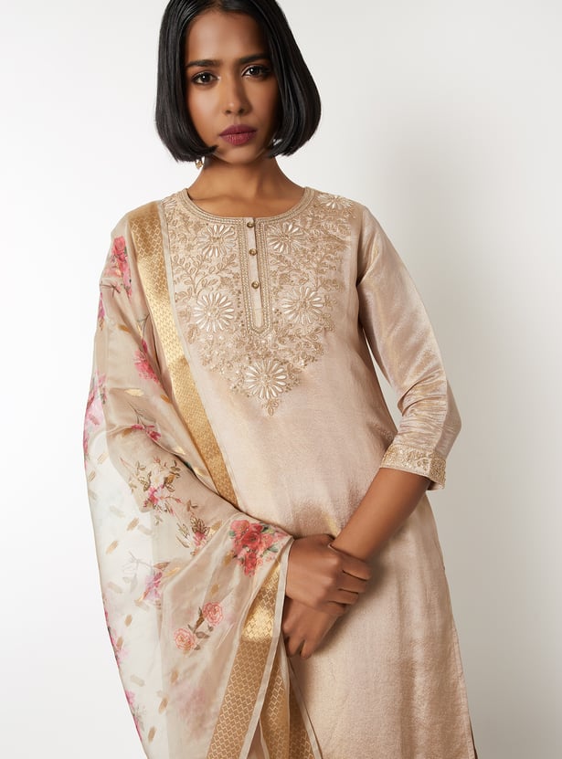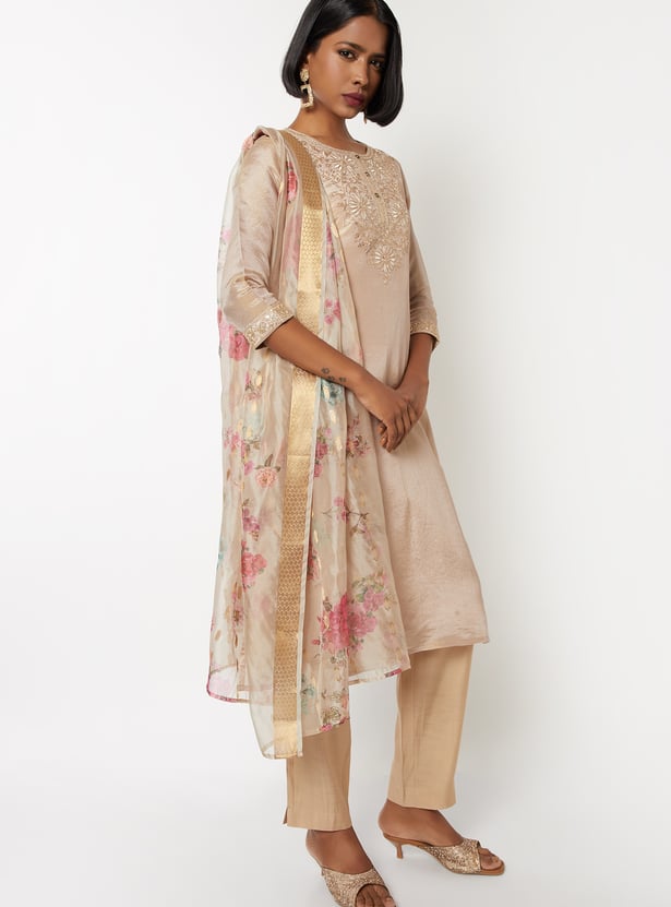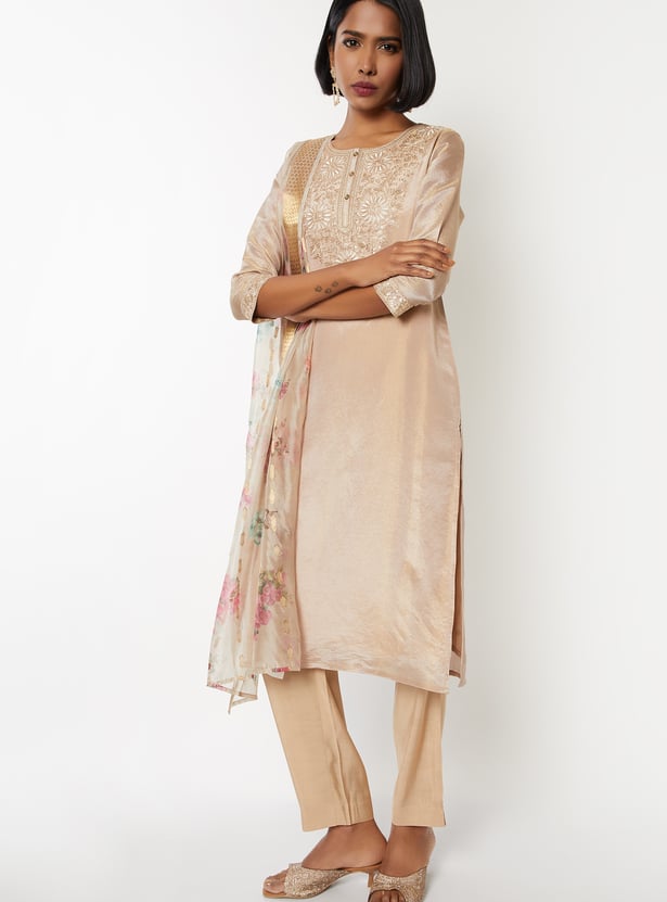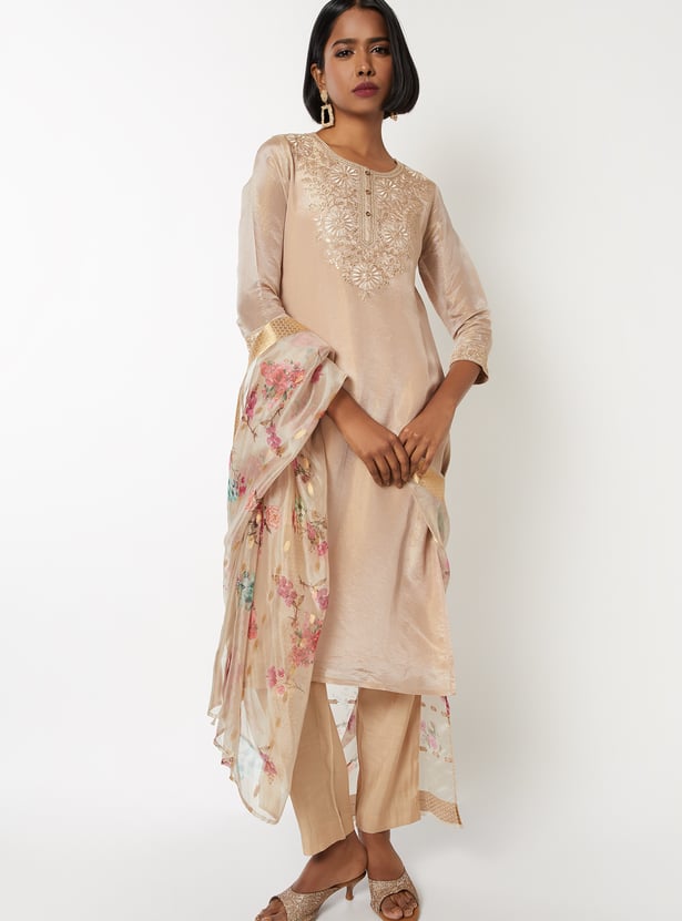Elevate your ethnic style with this floral embroidered straight kurta set. Featuring a round neck, 3/4th sleeves, and side slits, it’s paired with elasticated straight pants and a matching dupatta for a complete look.