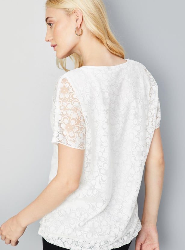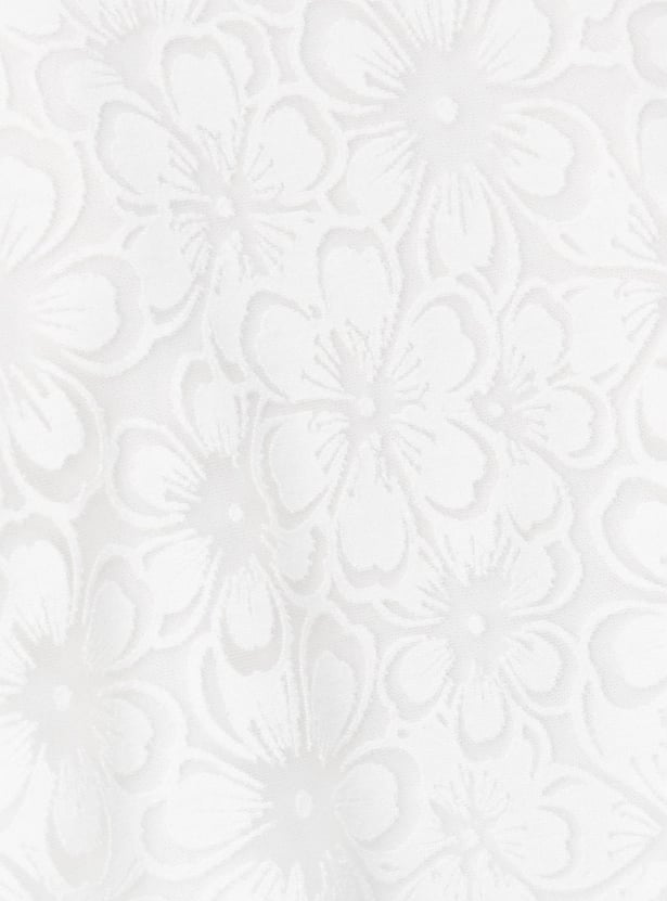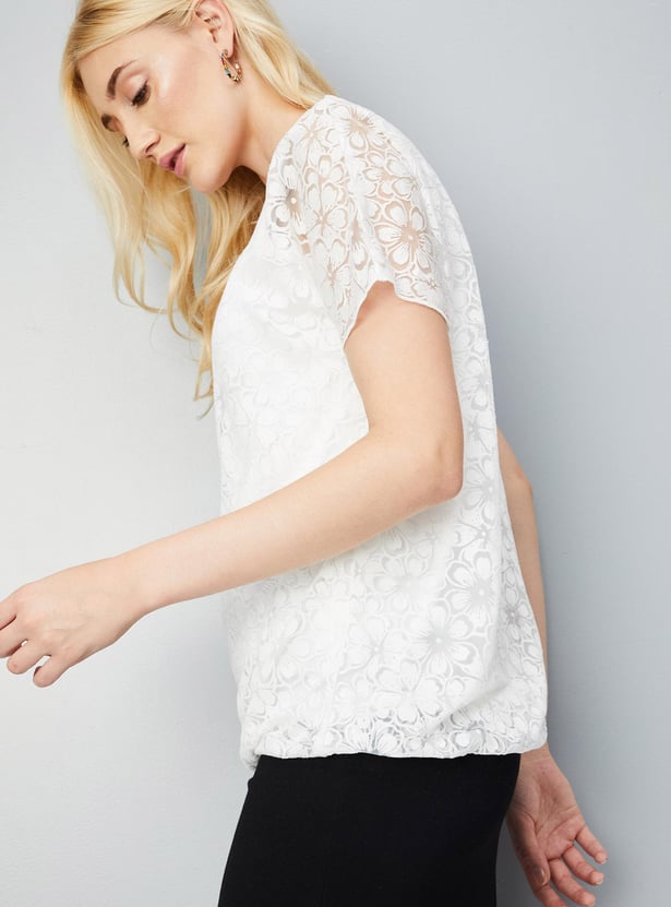 Elevate your casual wardrobe with this fashionable floral knit top. With its round neck and half sleeves, it offers a classic yet trendy silhouette.