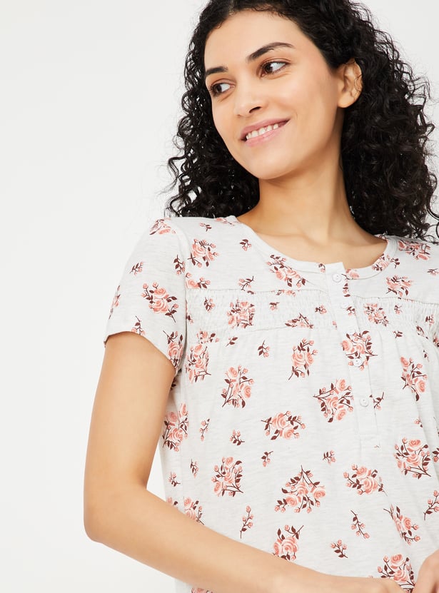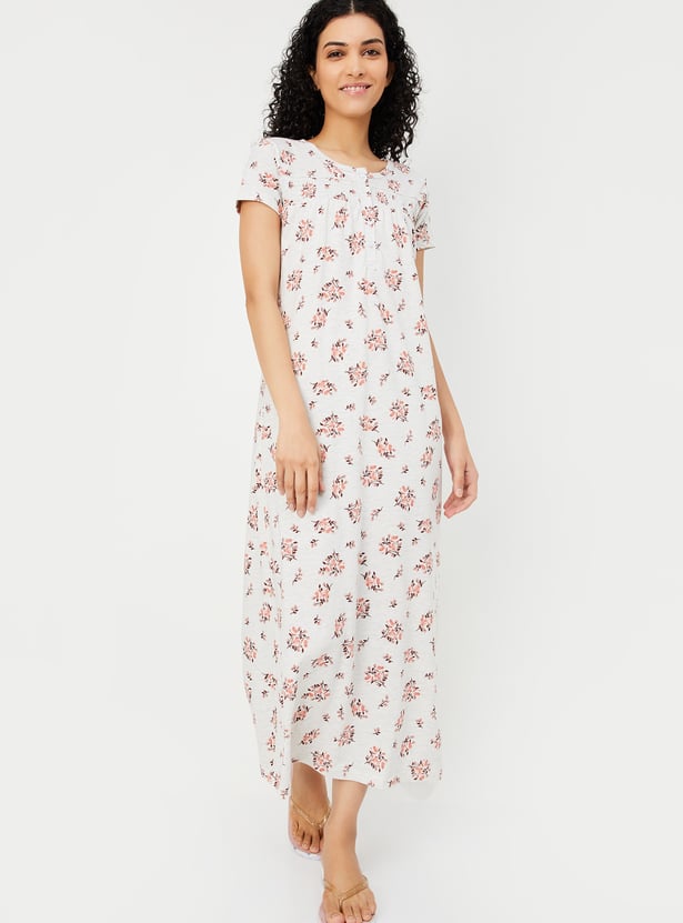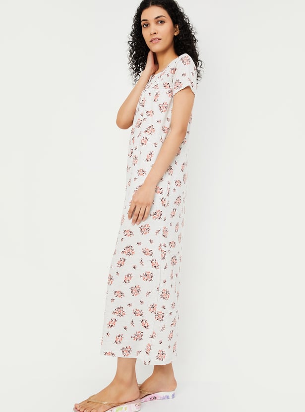 Drift off into peaceful slumber with this charming nightgown, featuring an all-over floral print for a soothing vibe. Designed with a round neck, half sleeves, and smocking detail at the yoke, it offers both style and comfort. The button closure adds a touch of practicality, making it perfect for relaxed evenings and restful nights. Model Size :
