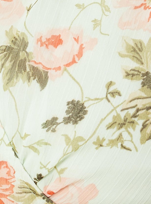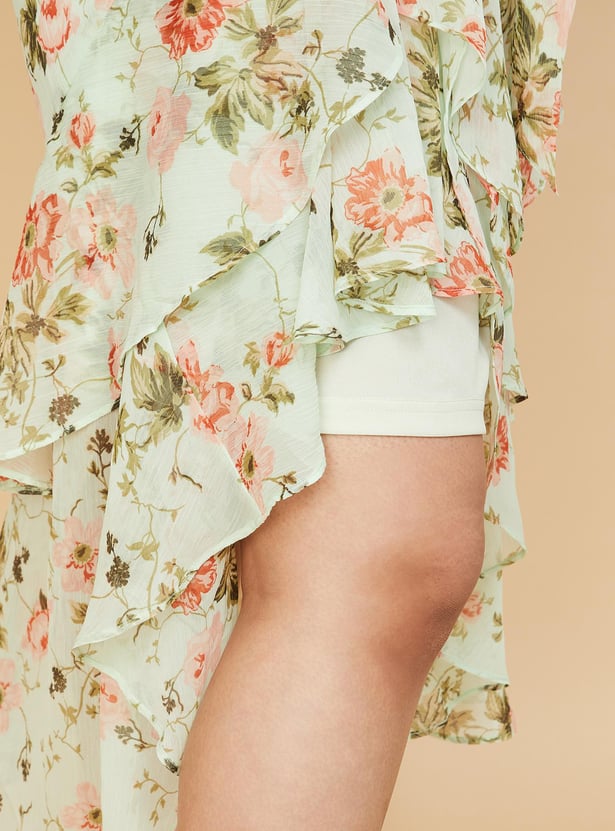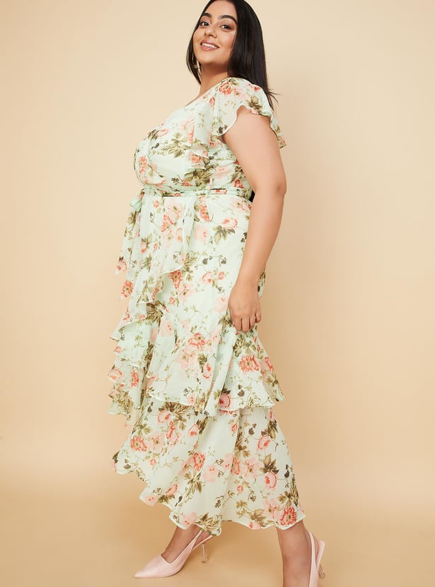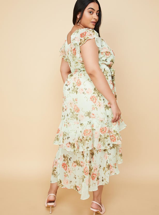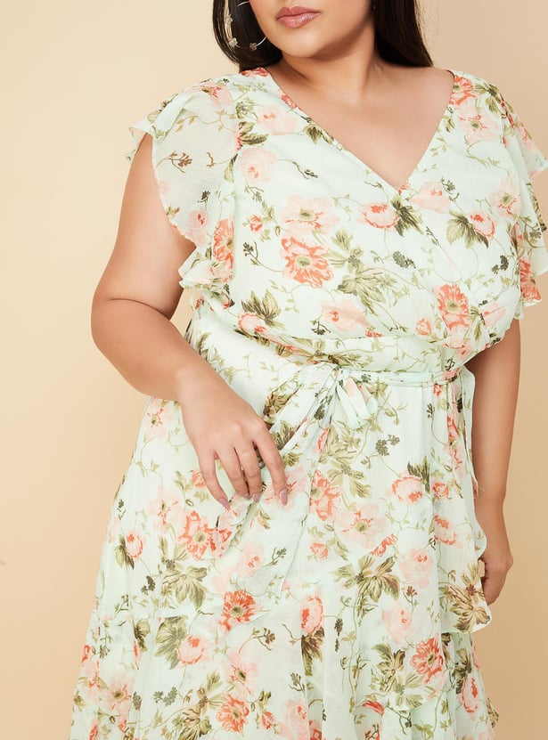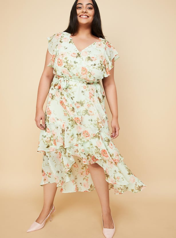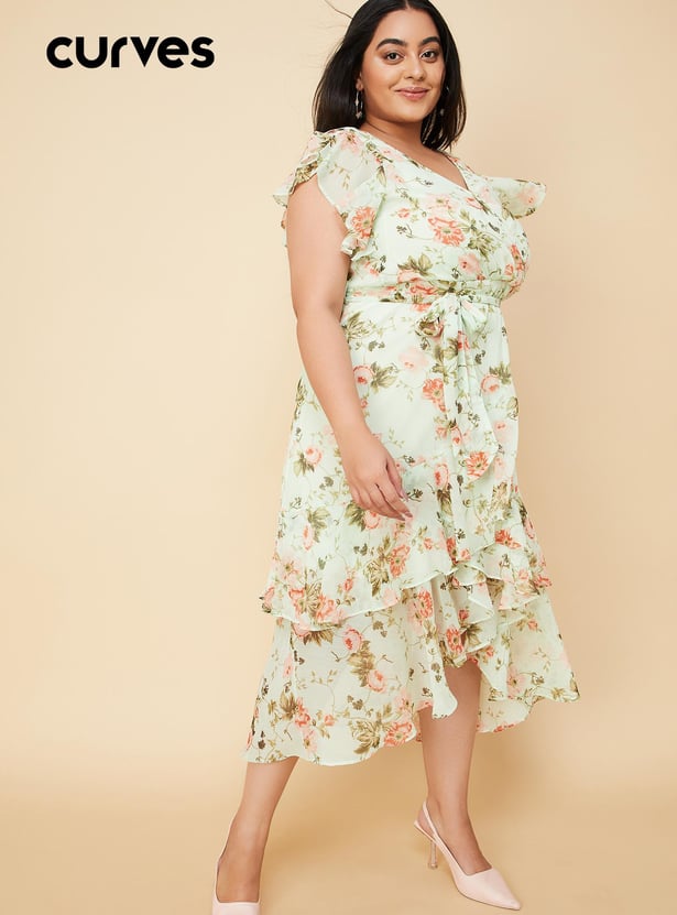 Breeze through the day in style with this floral printed dress. Featuring a V-neck, flutter sleeves, an asymmetric hem with ruffle detail, and a midi-length profile. Model Size :