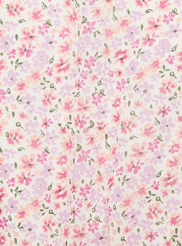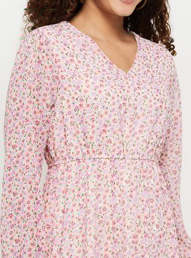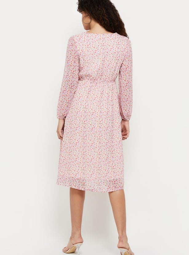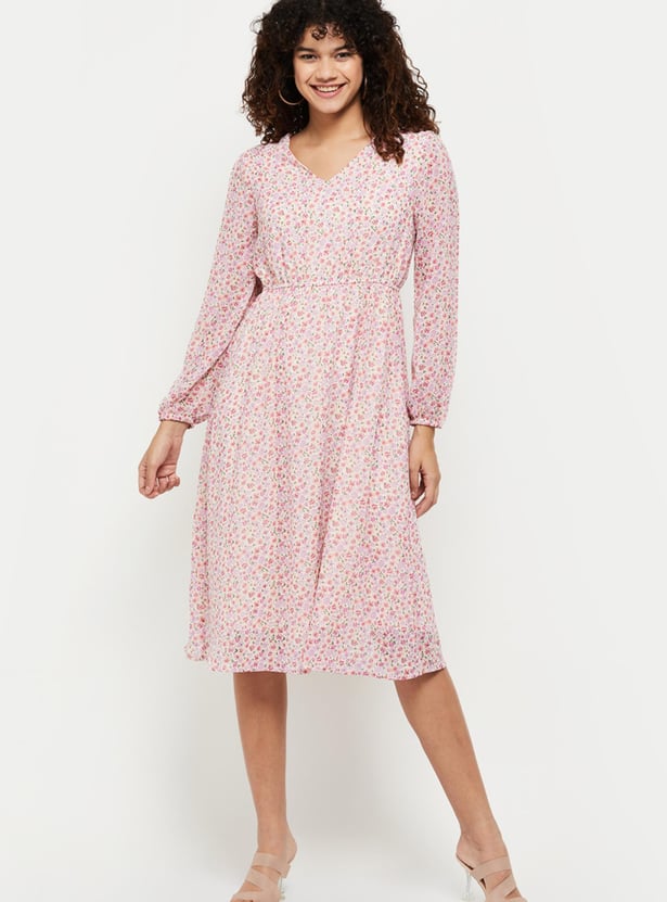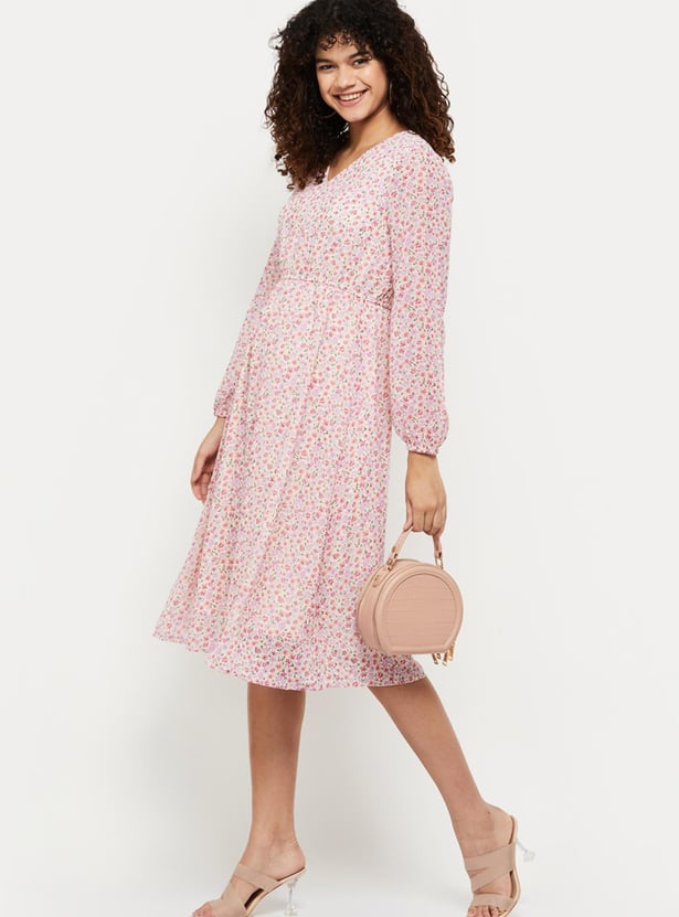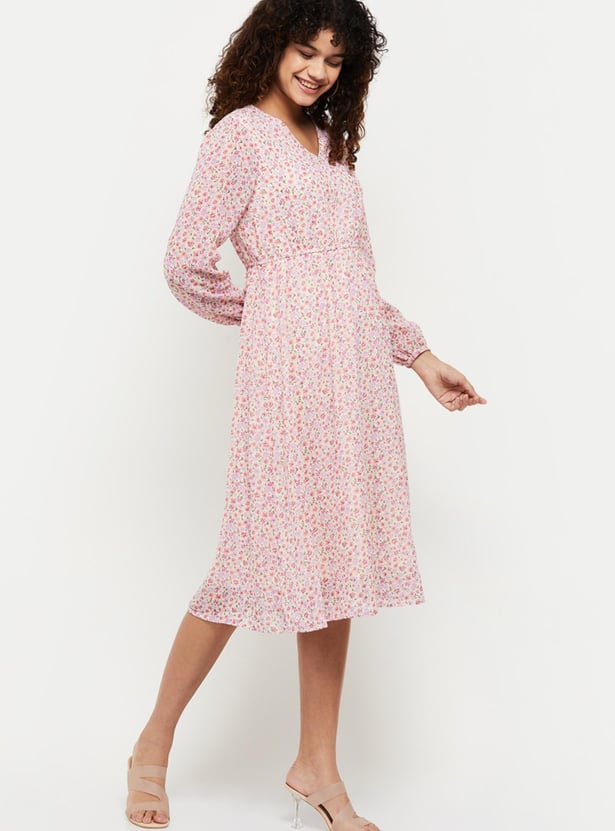 Designed with floral prints, this midi-length dress with V-neckline, long sleeves, and a cinched waist is an elegant addition to your wardrobe.