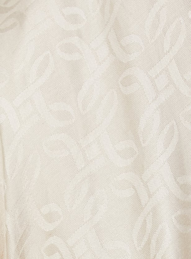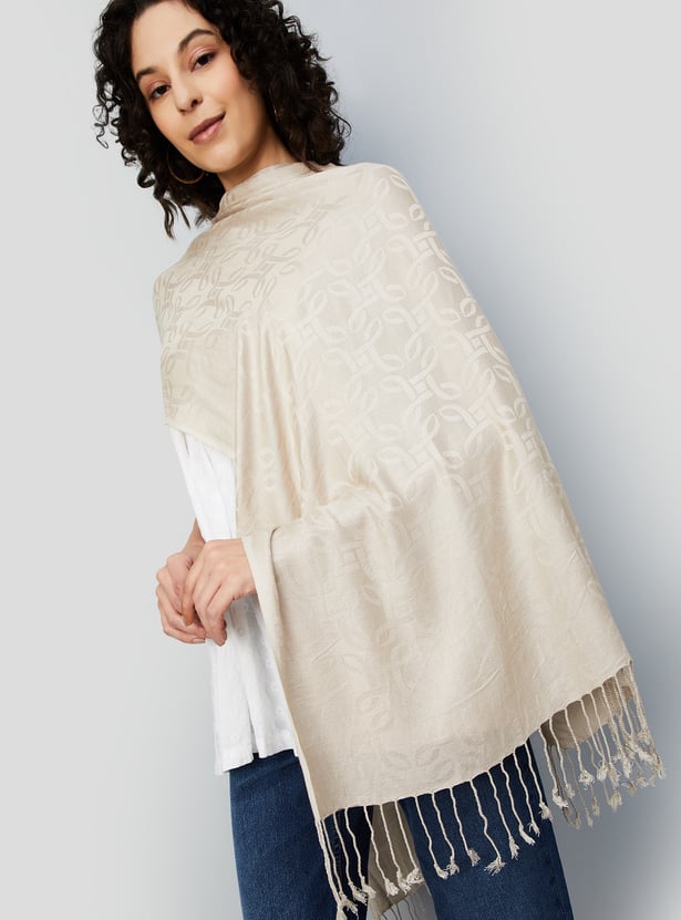 Elevate any outfit with this stunning scarf, crafted with a tonal jacquard pattern that exudes elegance. The exquisite design is complemented by a charming tassel trim, adding a delightful boho touch.
