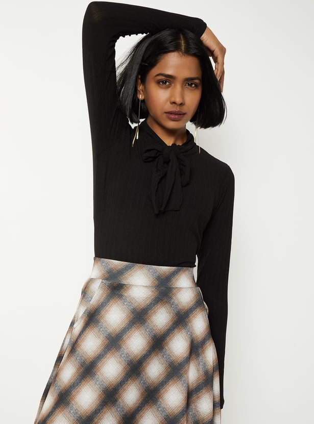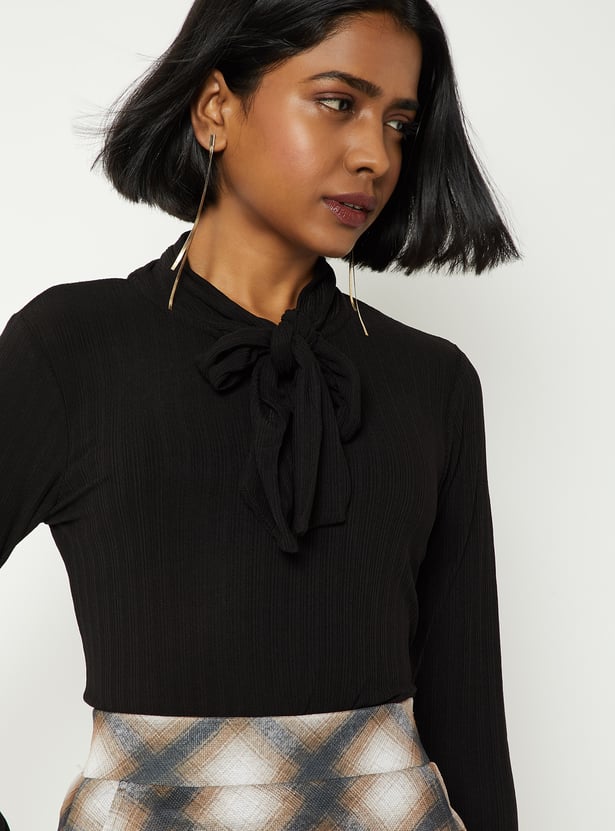 Step out in stylish comfort with this knit blouse, featuring a tie-up neck and full sleeves for a chic look. Perfect for adding a cozy yet elegant touch to any outfit. Model Size :