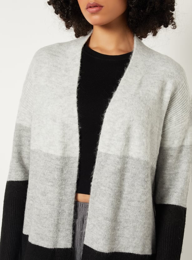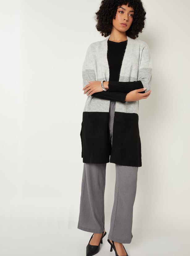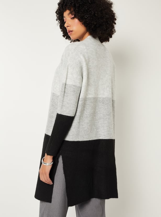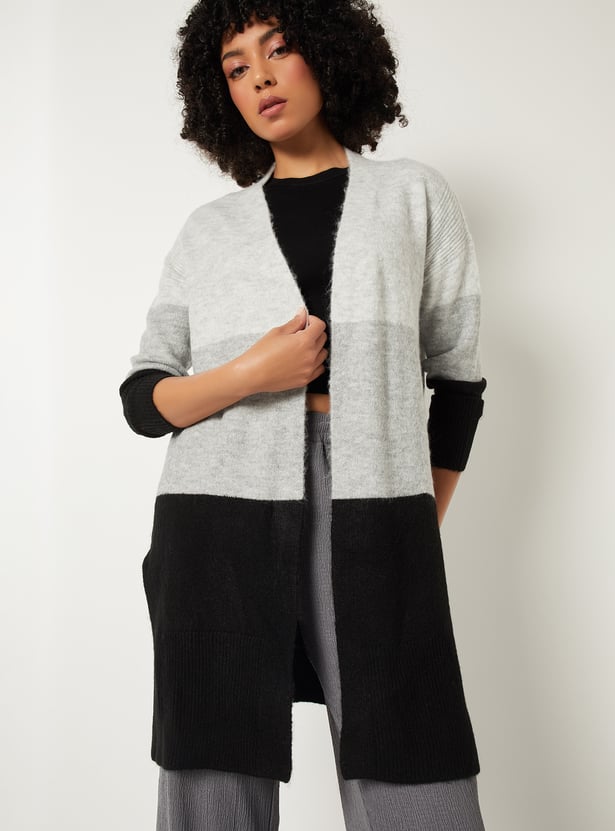 Layer up in style with this colourblock longline cardigan, featuring full sleeves and an open front for a relaxed, easy fit. The bold colourblocking adds a modern touch to this cozy essential. Model Size :