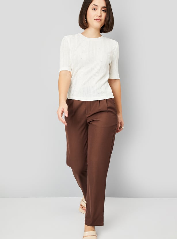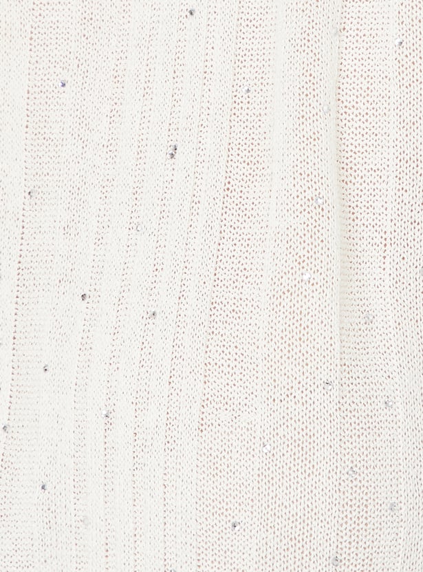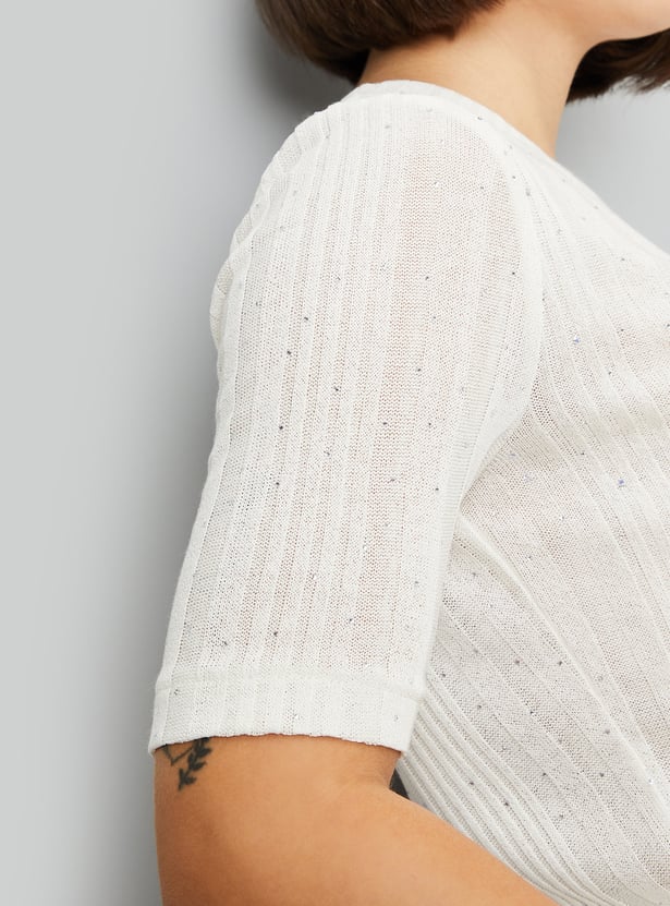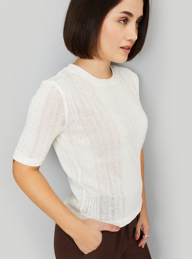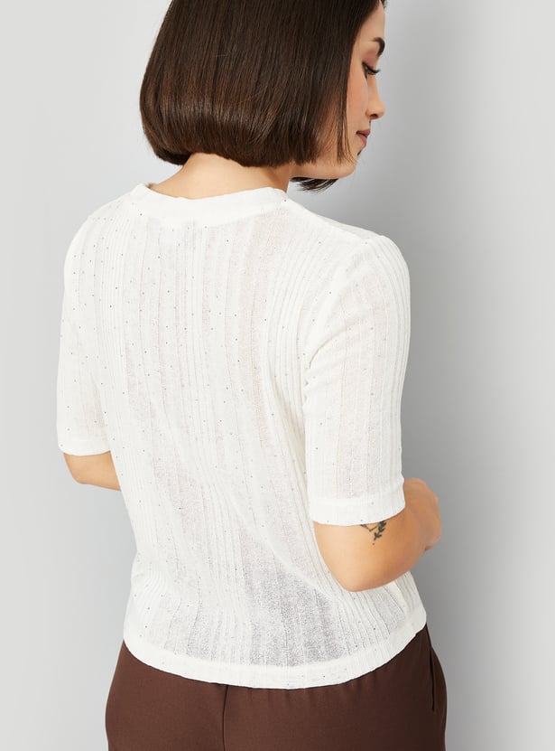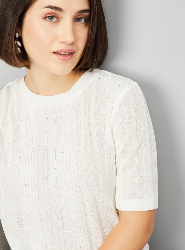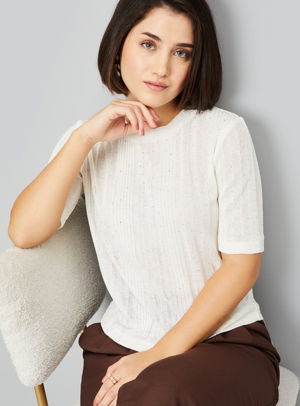 Add a touch of elegance to your wardrobe with this knit embellished top. The round neck and half sleeves offer a relaxed yet stylish look, while the subtle embellishments bring a refined flair.