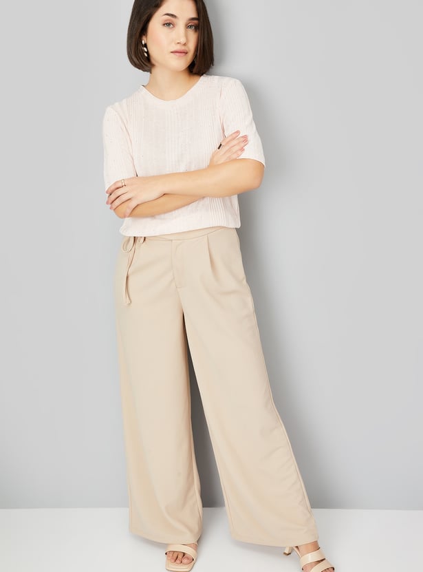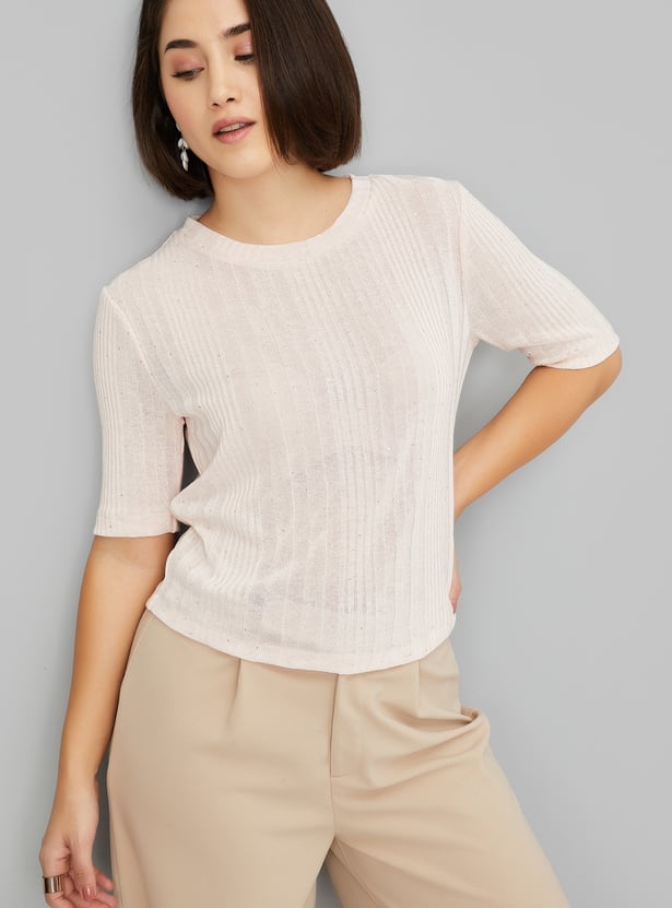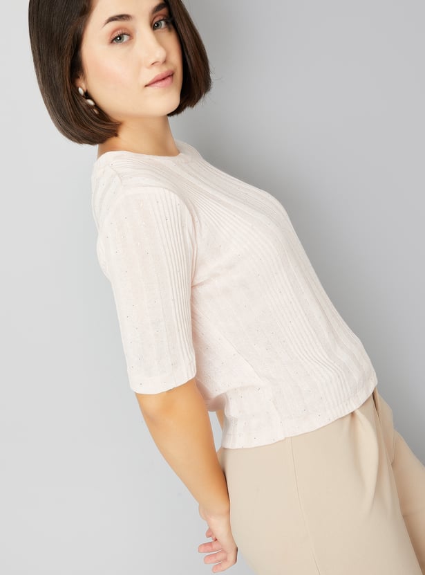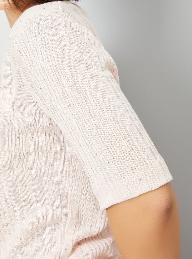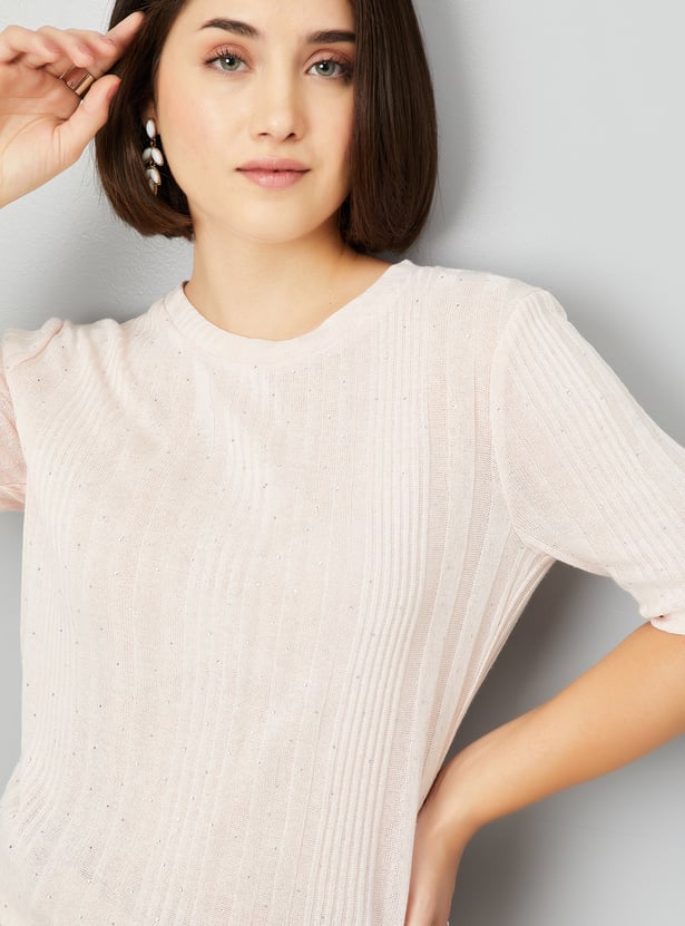 Add a touch of elegance to your wardrobe with this knit embellished top. The round neck and half sleeves offer a relaxed yet stylish look, while the subtle embellishments bring a refined flair.