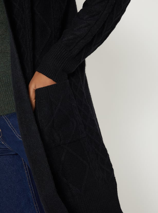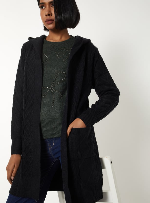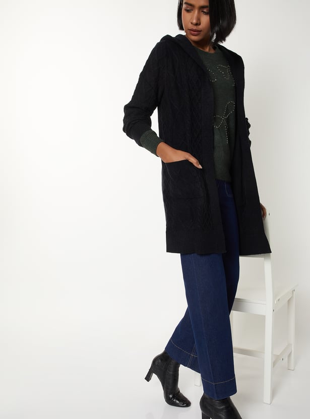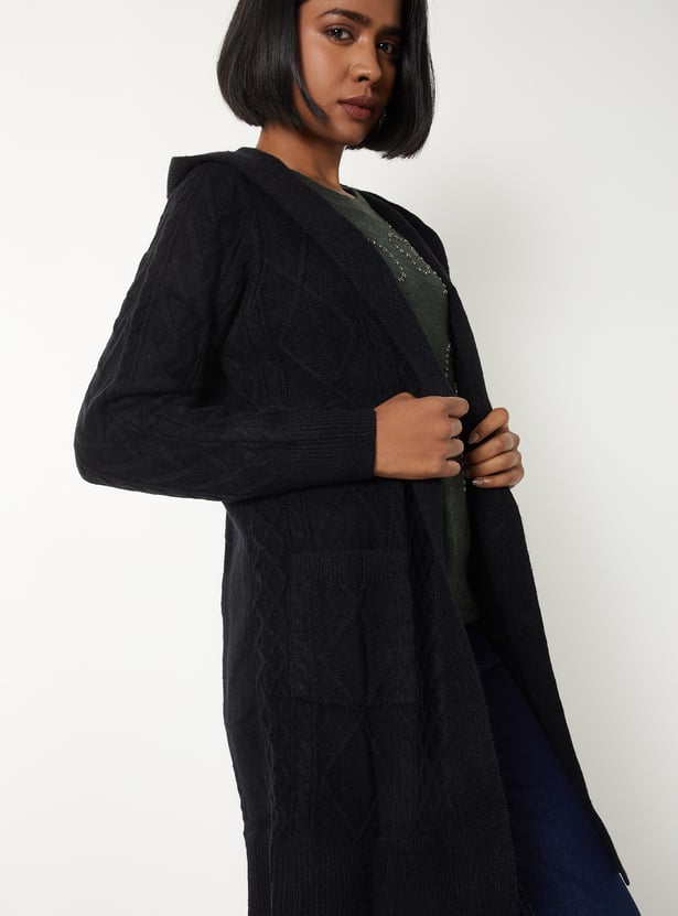 Stay snug and stylish in this knit hooded longline cardigan, featuring full sleeves, a cozy hooded neck, and handy pockets. Model Size :