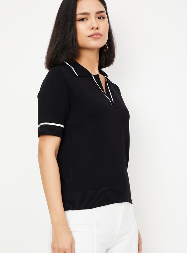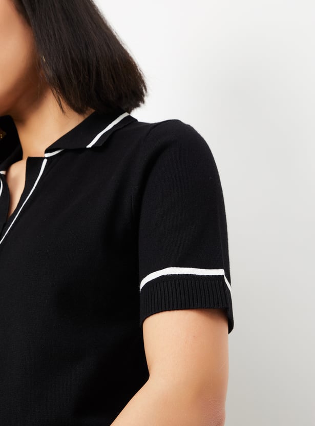 Get ready to step up your style game with this knit polo T-shirt that’s the perfect blend of classic and cool! Featuring a sharp polo collar, half sleeves, and striped detailing along the neckline and sleeves, it’s the ultimate combo of sporty and stylish.